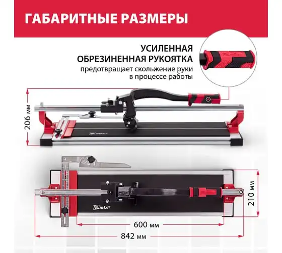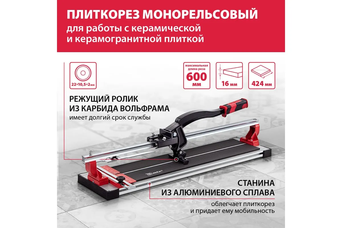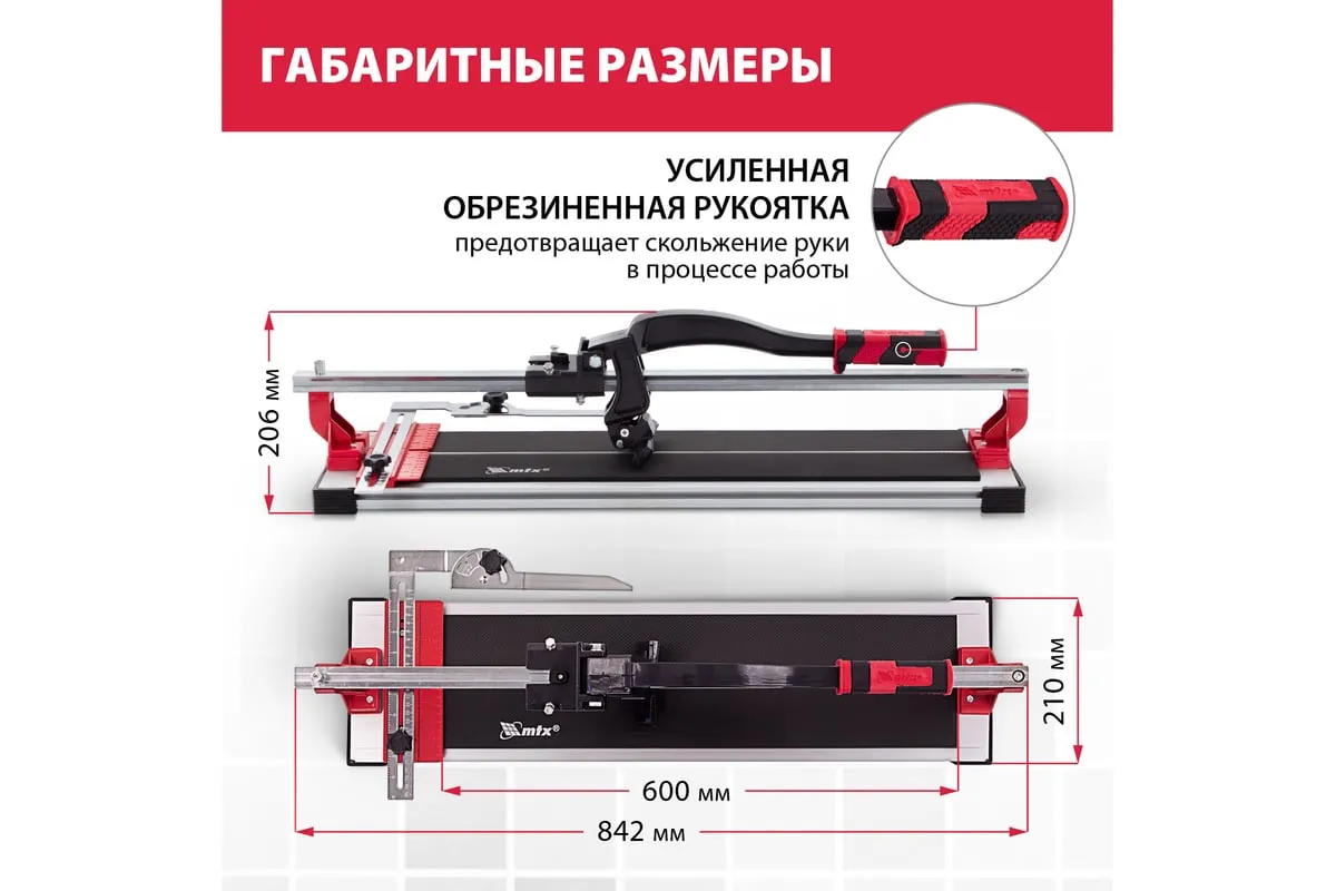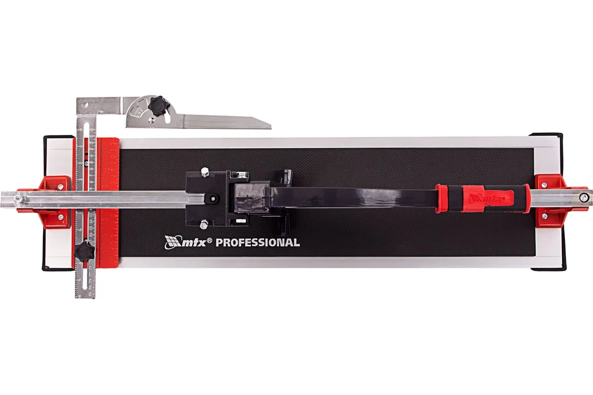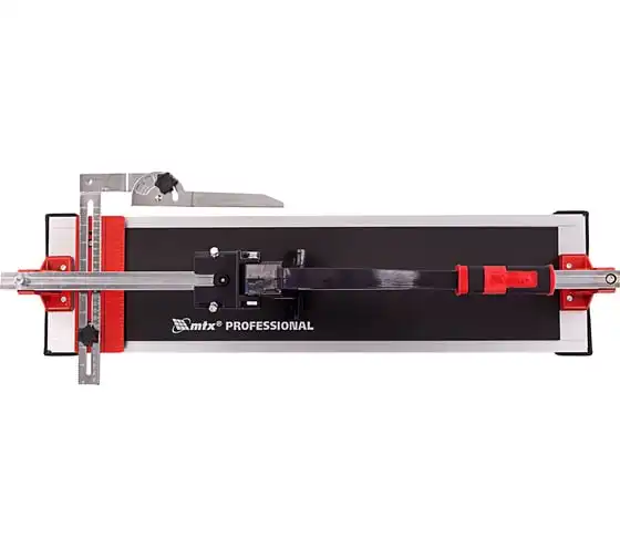 Рельсовый плиткорез 600 мм MTX PROFESSIONAL 87688 представляет собой современное устройство, которое служит для разрезания кафельной плитки большого размера. Станина имеет традиционную форму и изготавливается из алюминиевого сплава, что обеспечивает небольшой вес и мобильность. Благодаря специальному покрытию рейки достигается надежное сцепление шарикового механизма с рельсом.