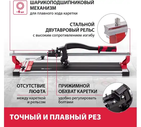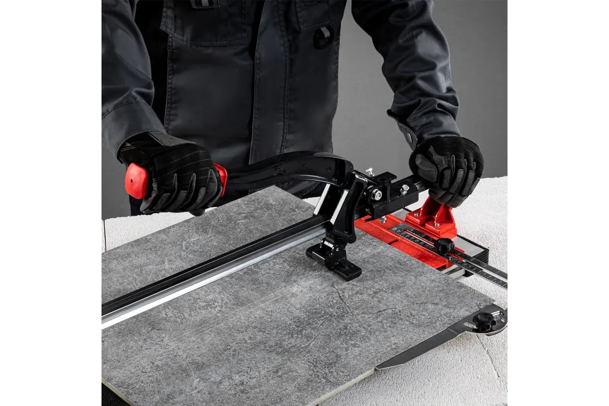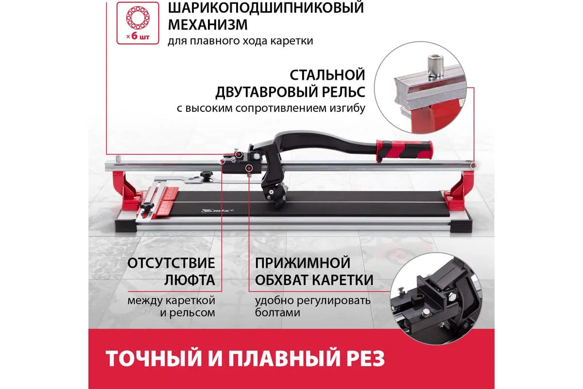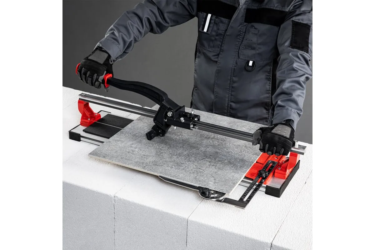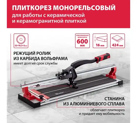 Рельсовый плиткорез 600 мм MTX PROFESSIONAL 87688 представляет собой современное устройство, которое служит для разрезания кафельной плитки большого размера. Станина имеет традиционную форму и изготавливается из алюминиевого сплава, что обеспечивает небольшой вес и мобильность. Благодаря специальному покрытию рейки достигается надежное сцепление шарикового механизма с рельсом.