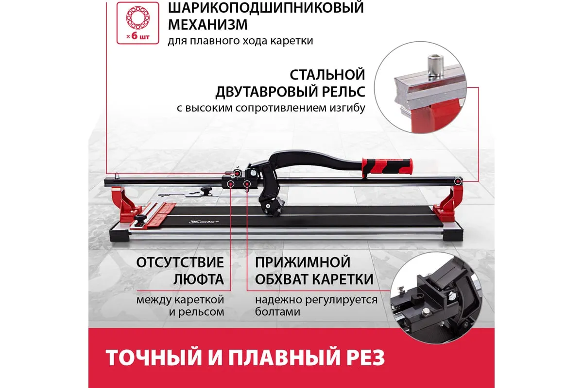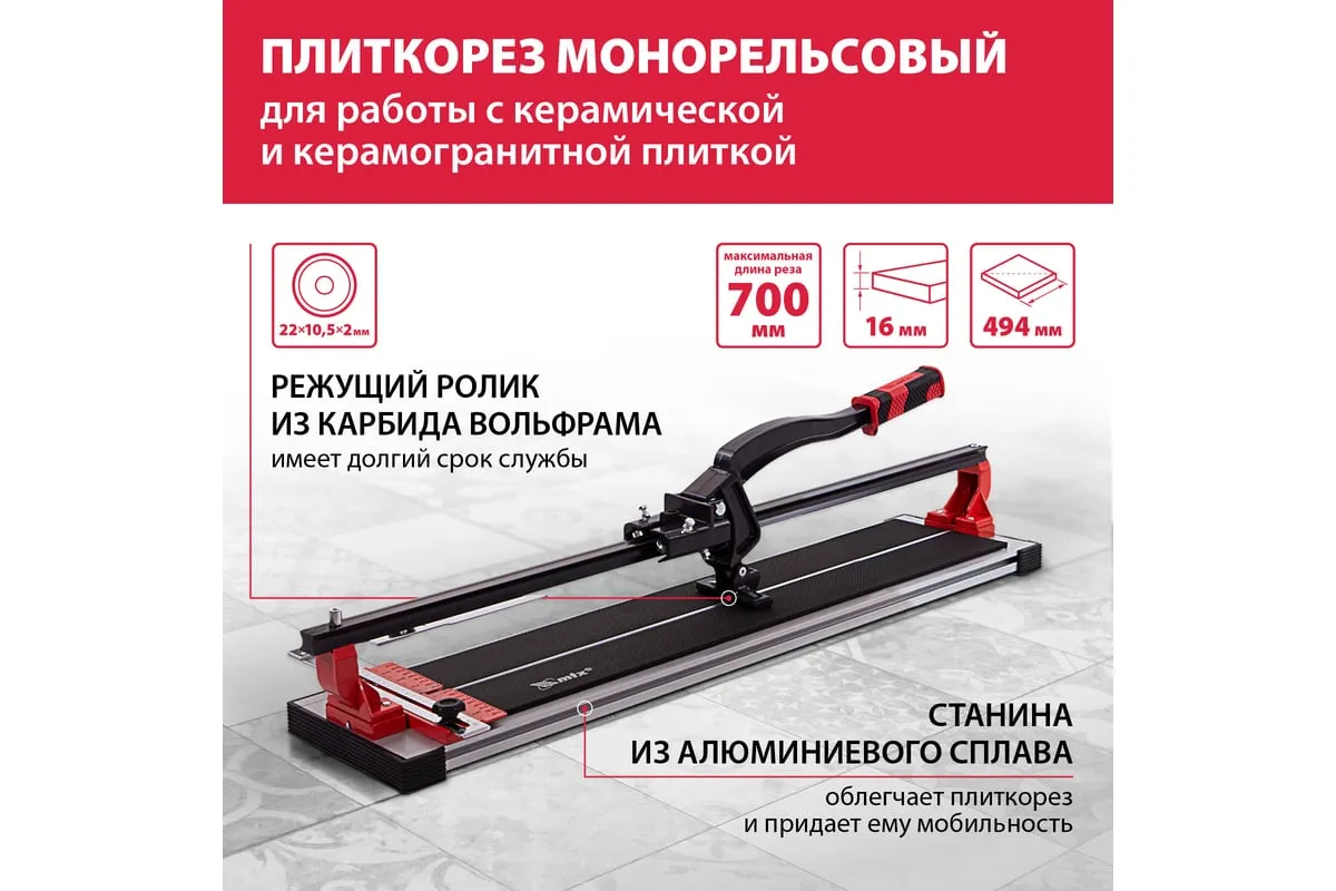 Рельсовый плиткорез 700мм MTX PROFESSIONAL 87689 - это новая модель плиткореза. Рельсовый плиткорез MTX поможет придать необходимый размер плитке длиной до 700 мм и толщиной до 16 мм. Пригодится в ходе проведения облицовочных работ. Мощный разделитель справится с резкой любого типа плитки, включая керамическую и керамогранитную. Благодаря продуманной конструкции плиткореза можно производить разлом в любой точке поверхности плитки.
