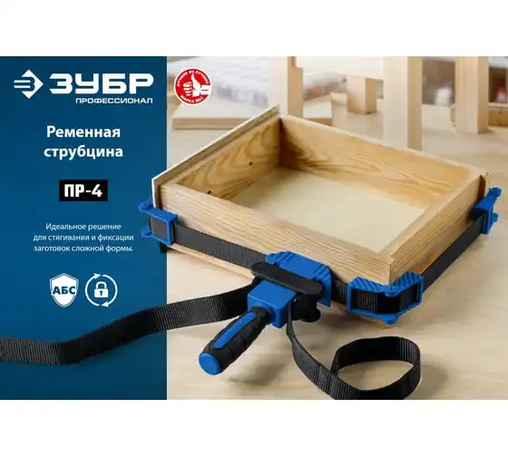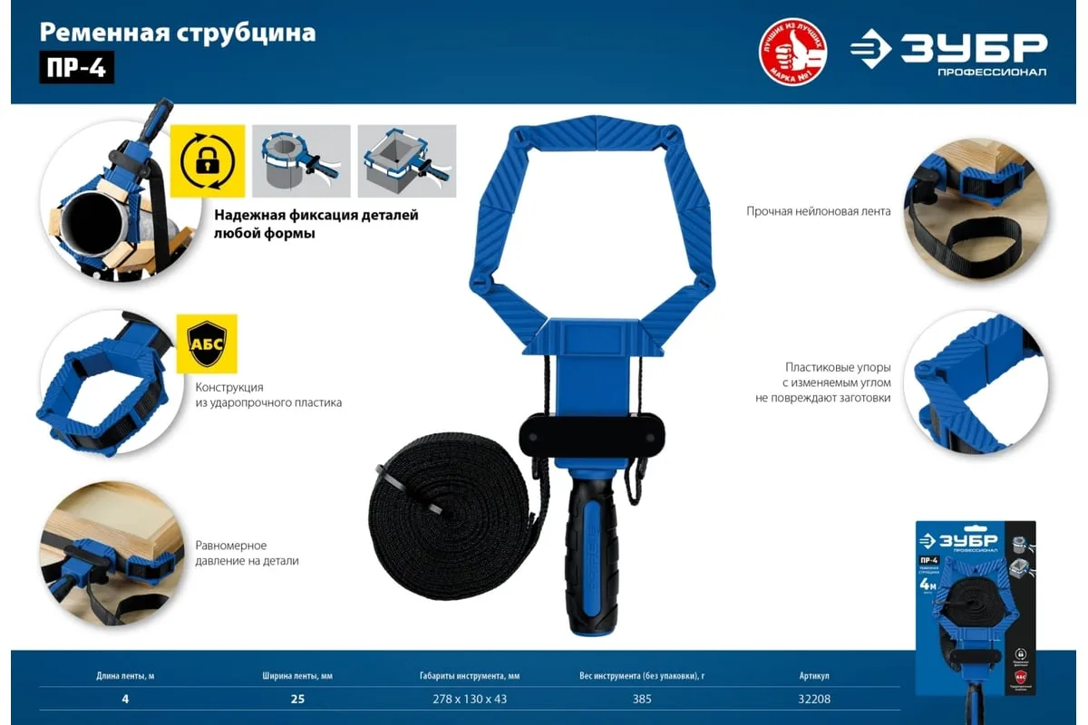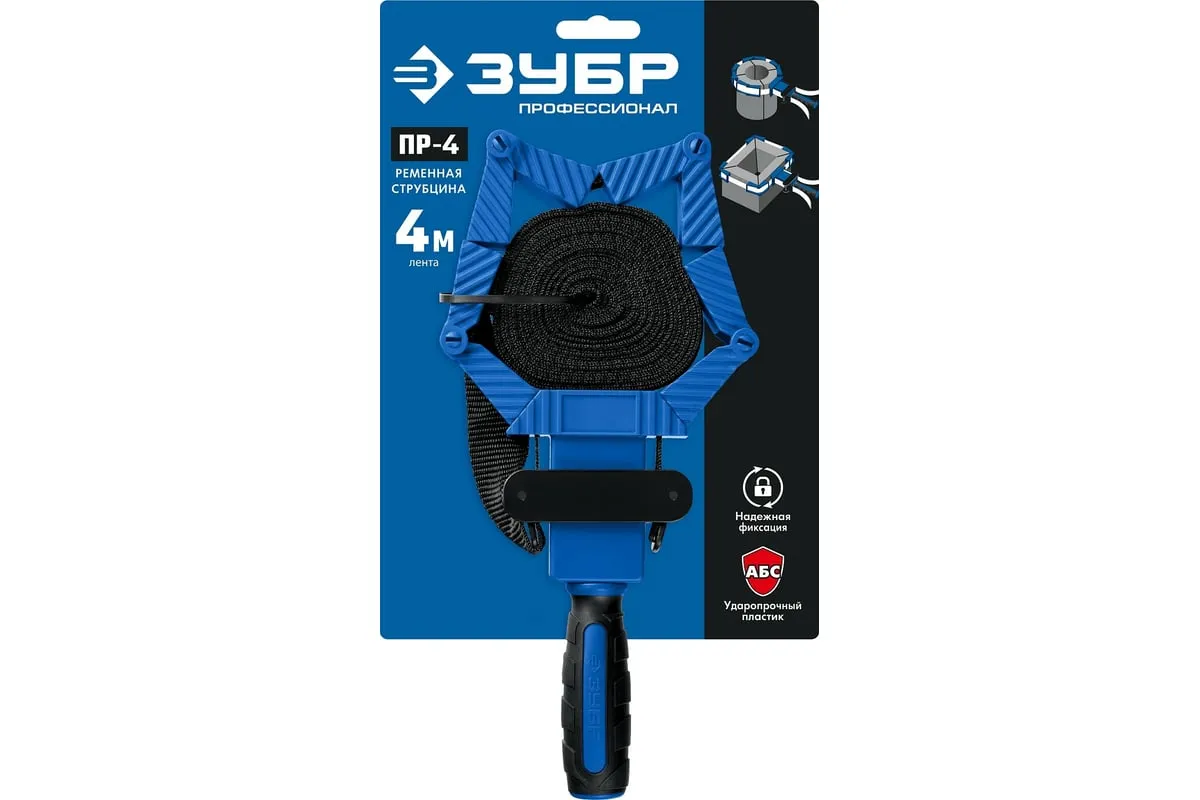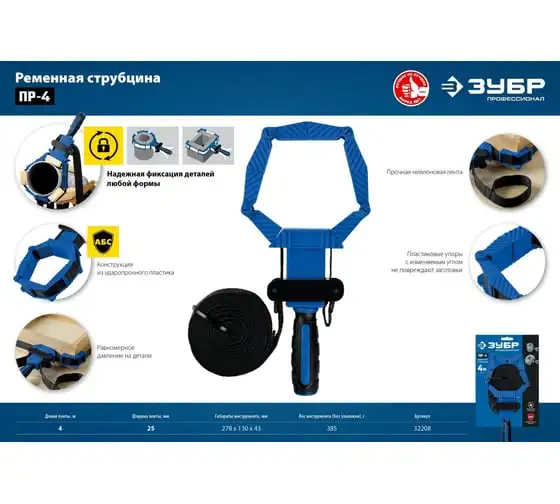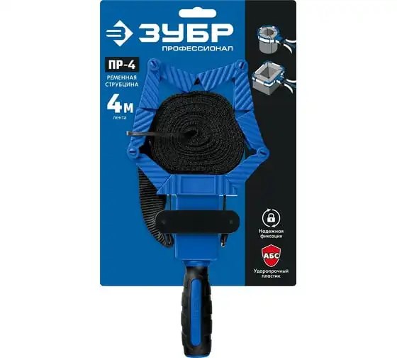 Ременная струбцина ЗУБР ПР-4 4 м 32208 представляет собой профессиональный ручной инструмент для стягивания и фиксации заготовок сложной формы. Отличается прочностью и высоким качеством исполнения. Конструкция струбцины выполнена из ударопрочного пластика ABS.