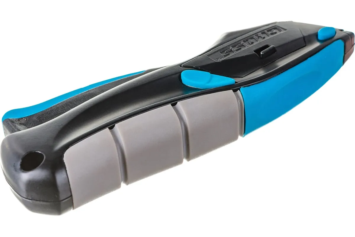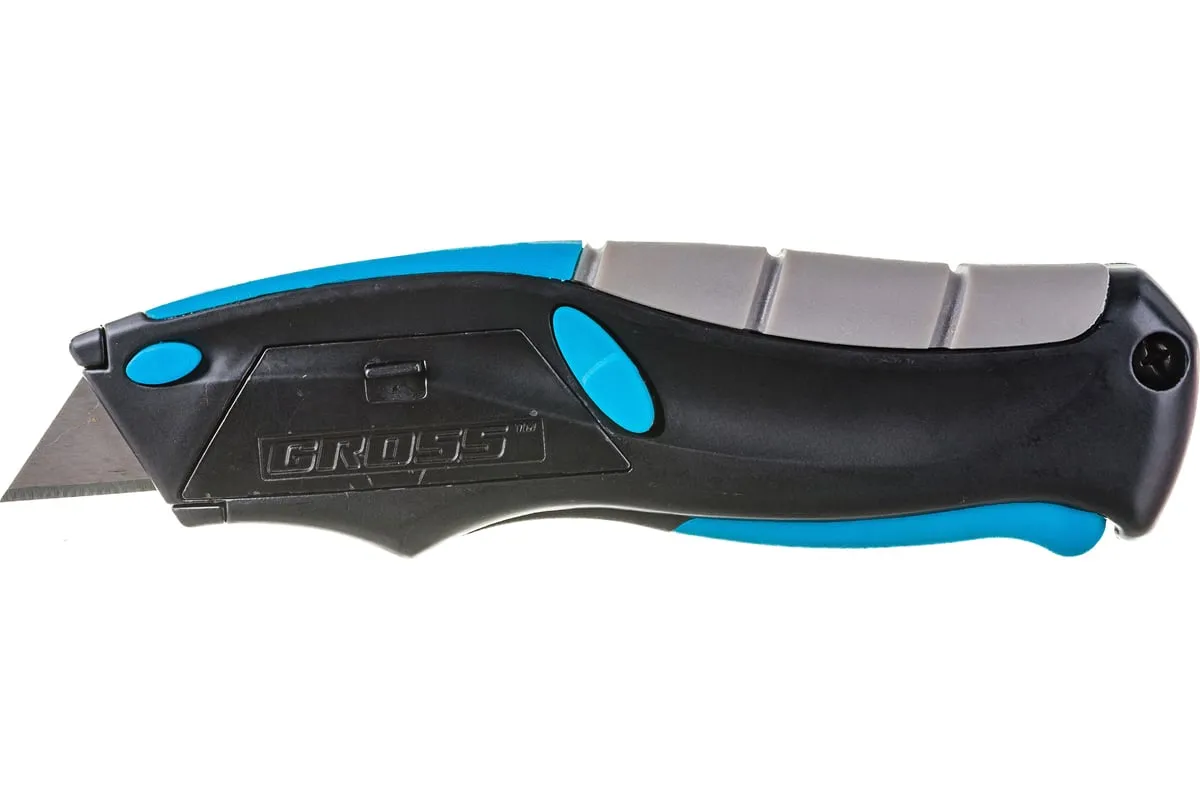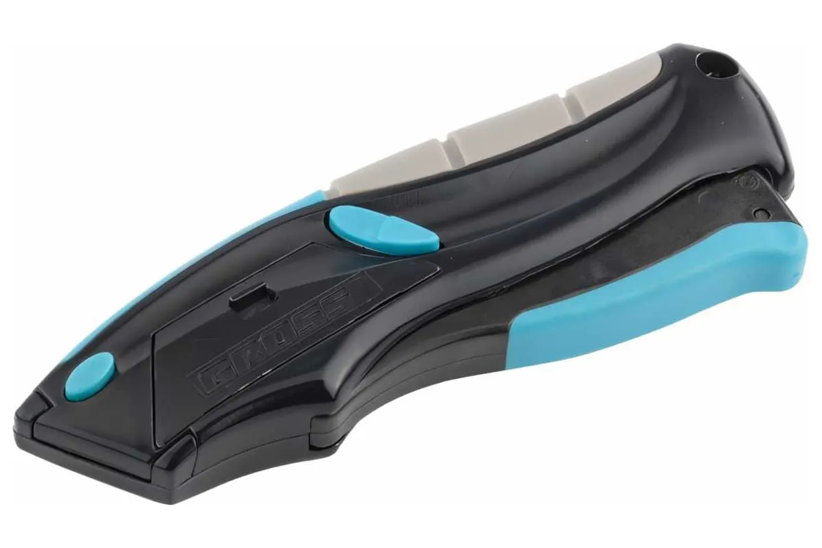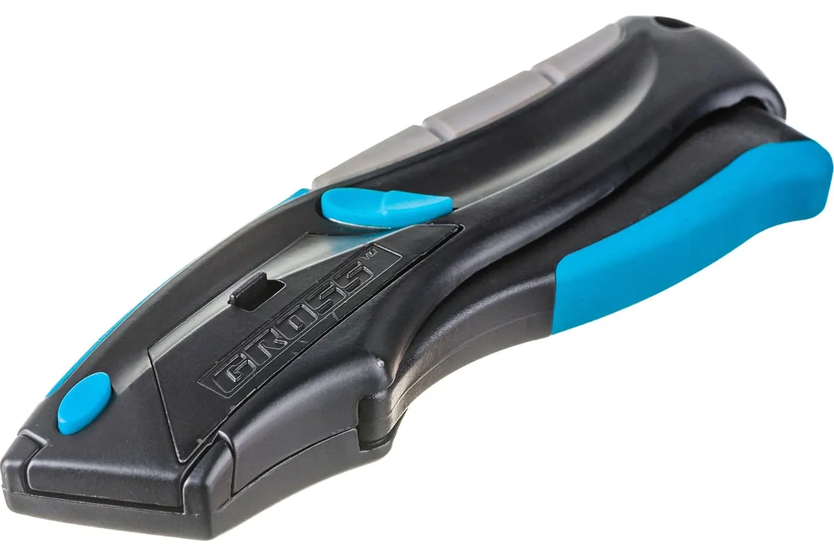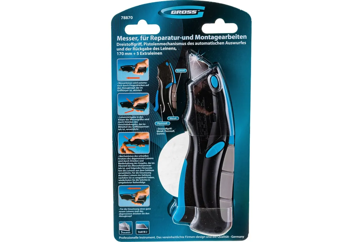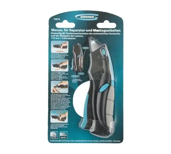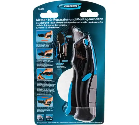Ремонтно-монтажный нож пистолетного типа Gross 78870 длиной 170 мм, с трехкомпонентной рукояткой, автовыбросом/возвратом лезвия и 5 запасными лезвиями, применяется для разрезания линолеума, картона, кожи и других материалов. Лезвия изготовлены из высокопрочной японской стали SK-2, поэтому не ломаются и долго не тупятся. Инструмент предназначен для профессиональных работ, но может использоваться и в быту.