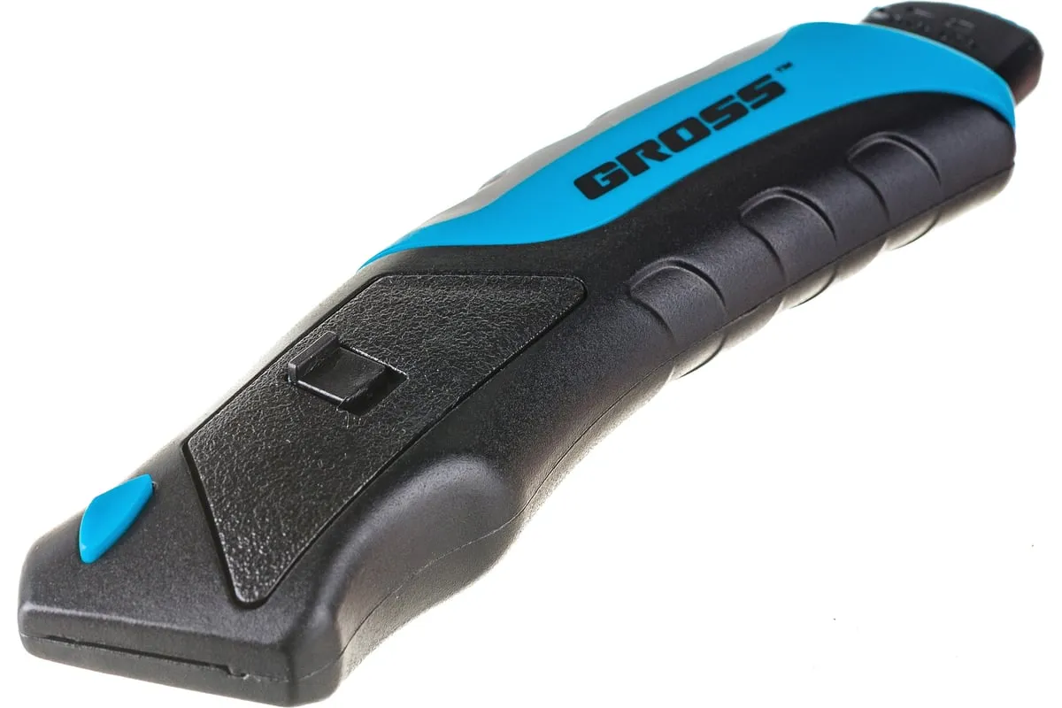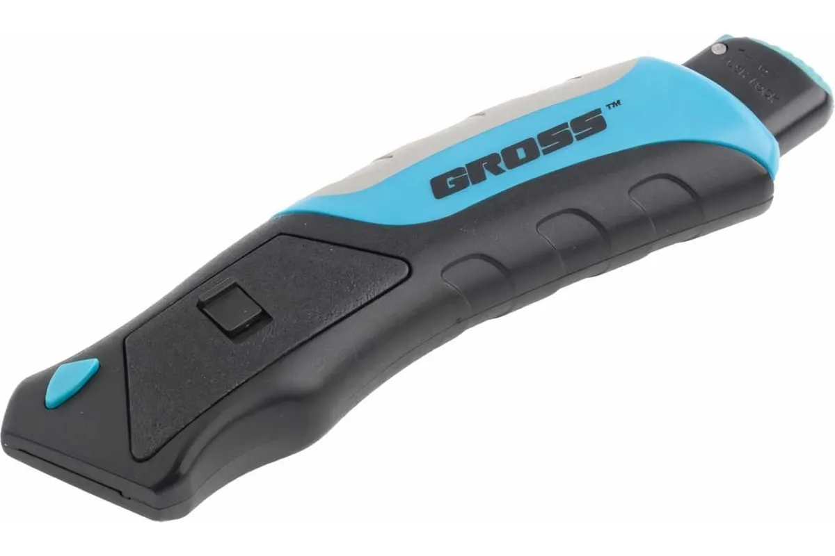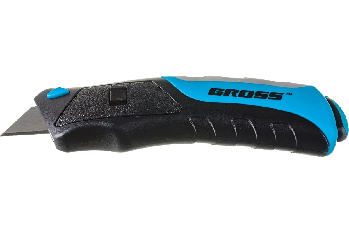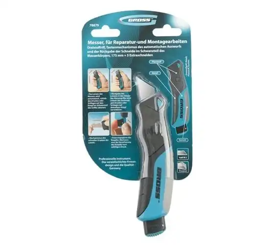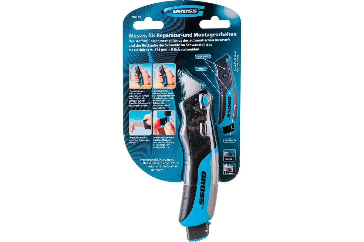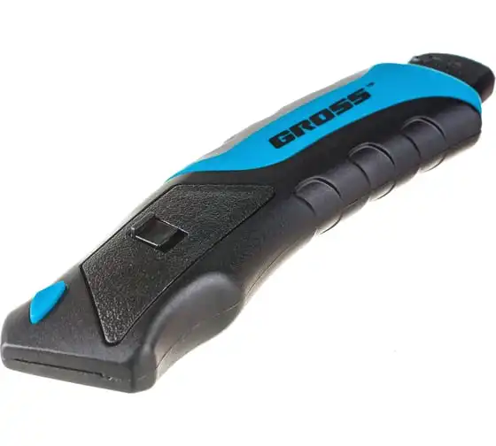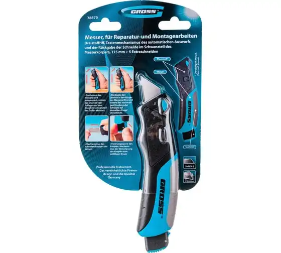 Ремонтно-монтажный нож Gross 78879 длиной 175 мм, с кнопочным автоматическим выбросом и возвратом лезвия, трехкомпонентной рукояткой и 5 запасными лезвиями, поможет раскроить линолеум или обои, разрезать картон, тонкий пластик, кожу, провода. Удобен в использовании — выброс лезвия и его возврат происходят автоматически при нажатии на кнопку с тыльной стороны корпуса. Нож является инструментом профессионального назначения, также будет полезен в быту.