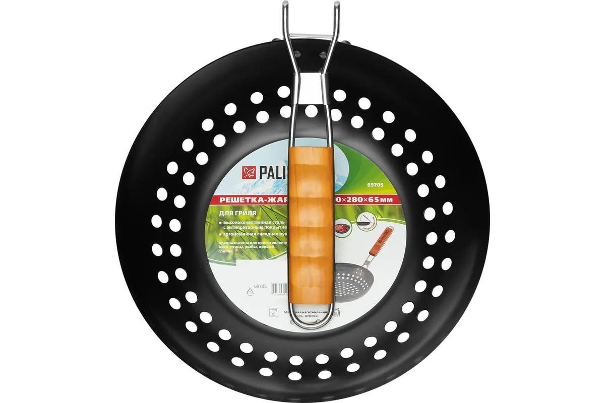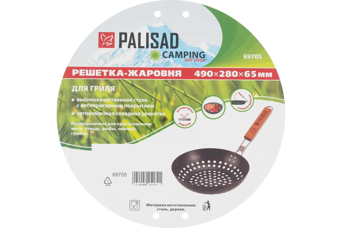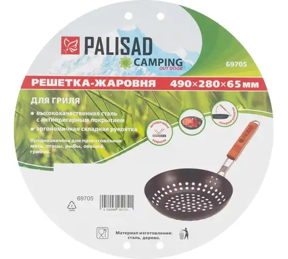 Решетка-жаровня PALISAD 490х280х65 мм, Camping 69705 представляет собой универсальное устройство для приготовления пищи на открытом огне. Изготовленная из жаропрочной стали, она обеспечивает долговечность и надежность в эксплуатации. Антипригарное покрытие позволяет легко очищать решетку после использования, предотвращая пригорание пищи. Круглая форма решетки способствует равномерному распределению тепла, что улучшает качество приготовления блюд. Деревянная ручка обеспечивает удобство в использовании, защищая руки от ожогов. Общая длина в 490 мм делает решетку компактной и удобной для транспортировки, что особенно важно для любителей кемпинга и пикников. Вес в 0.735 кг позволяет легко переносить решетку, не создавая лишней нагрузки.