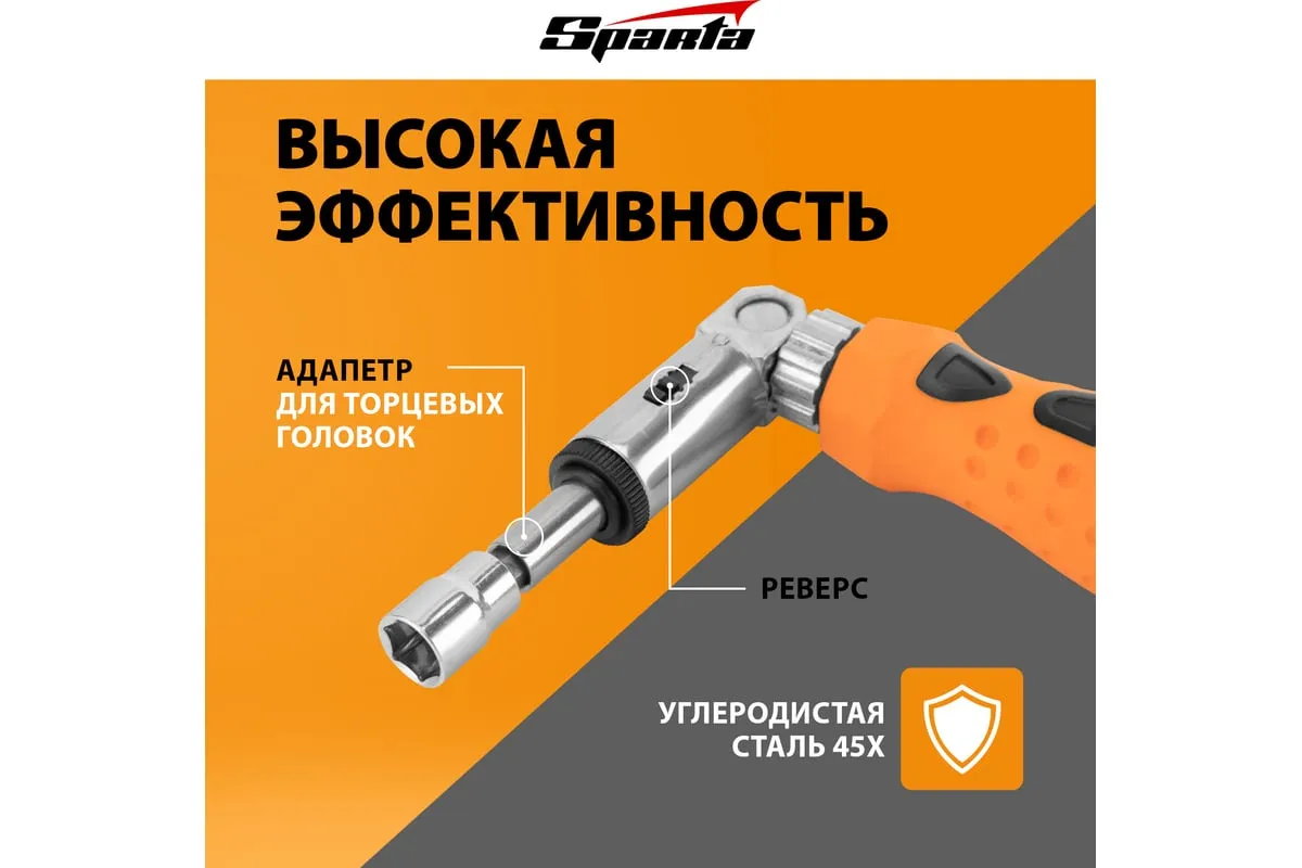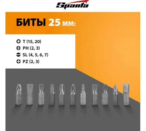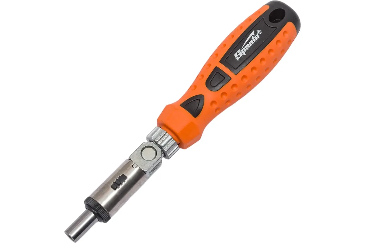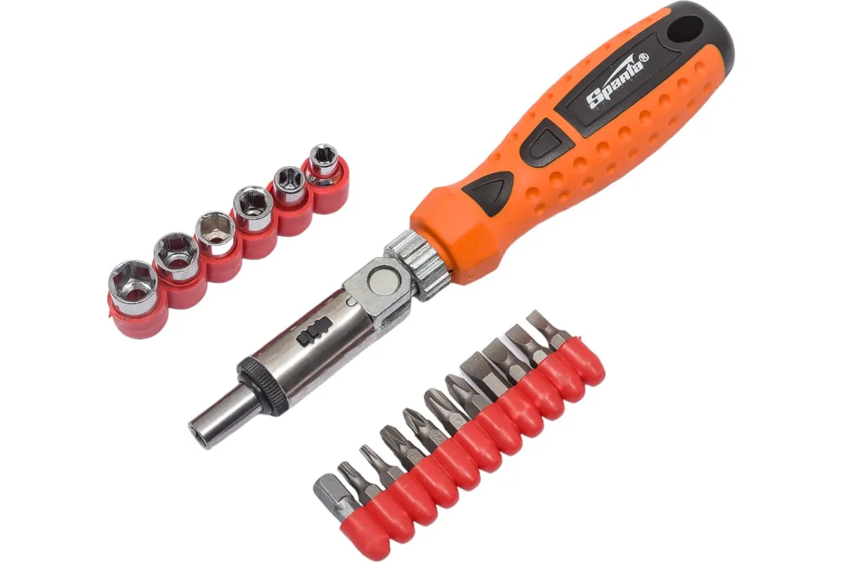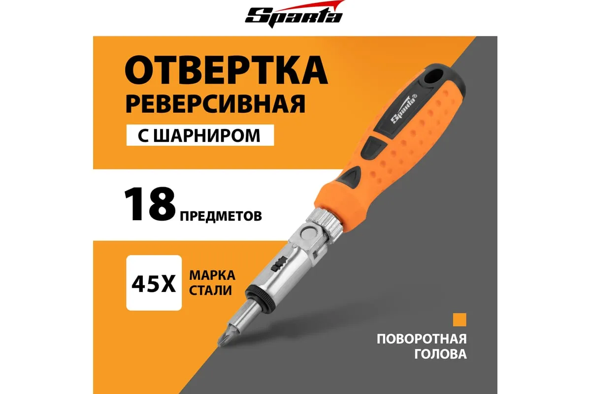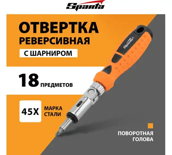 Реверсивная отвертка с шарниром, битами и головками 19 шт SPARTA 115545 активно используется для монтажных и демонтажных работ с крепежными элементами, имеющими различные профили: SL, PH, Torx и шестигранники. Набор имеет расширенную комплектацию, он включает в себя 18 насадок. Все компоненты удобно упакованы в специальный пластиковый бокс.