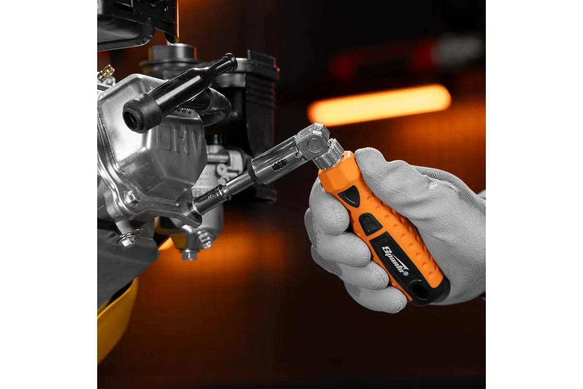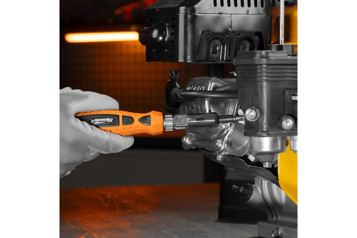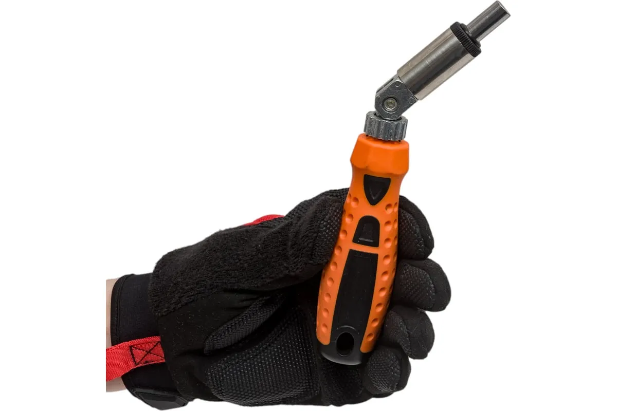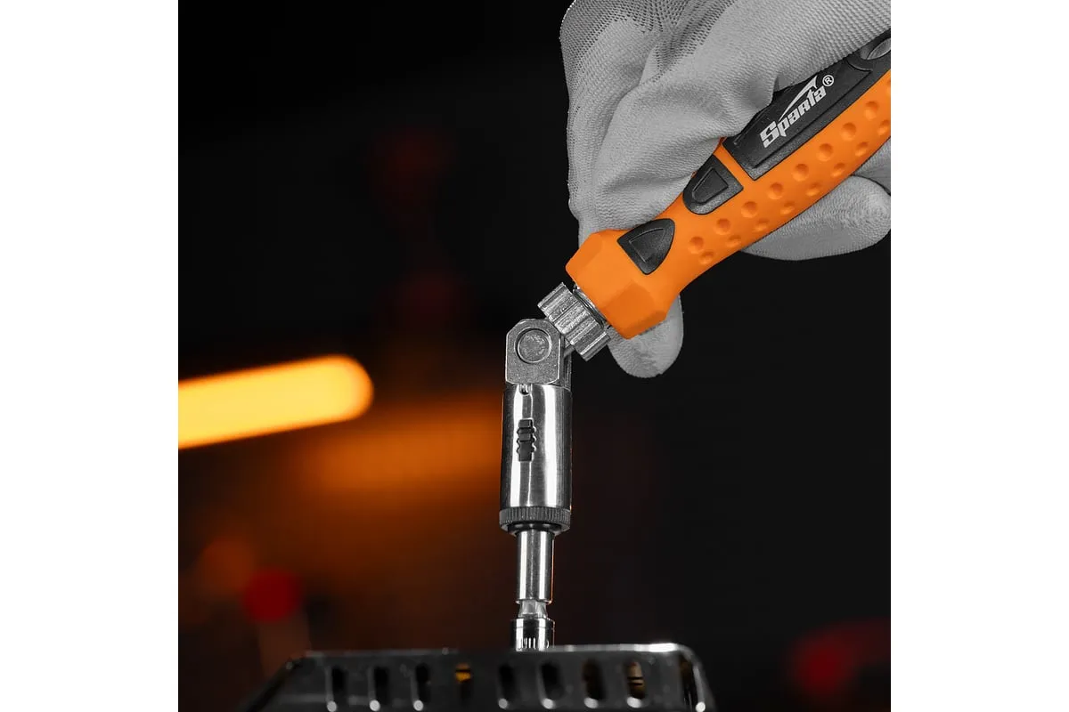 Реверсивная отвертка с шарниром, битами и головками 19 шт SPARTA 115545 активно используется для монтажных и демонтажных работ с крепежными элементами, имеющими различные профили: SL, PH, Torx и шестигранники. Набор имеет расширенную комплектацию, он включает в себя 18 насадок. Все компоненты удобно упакованы в специальный пластиковый бокс.