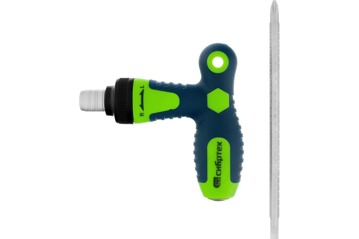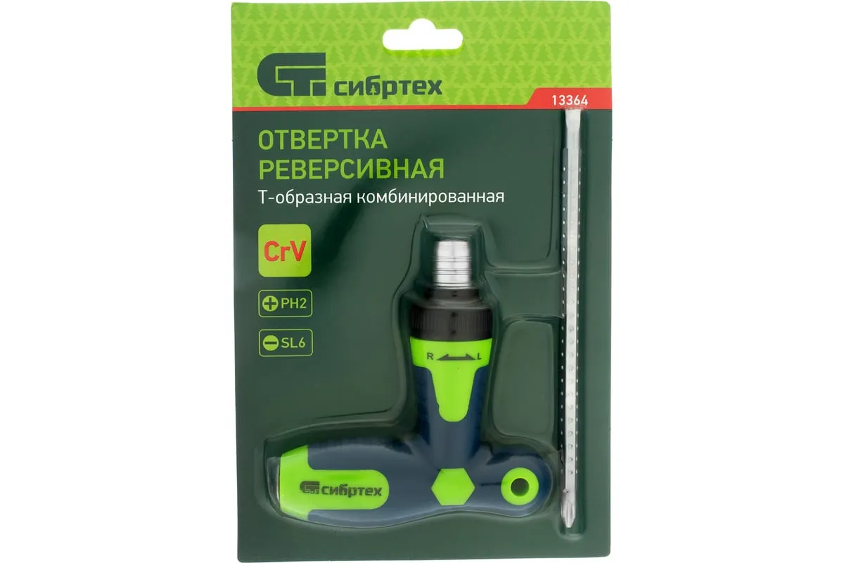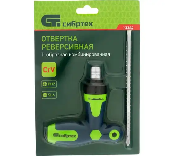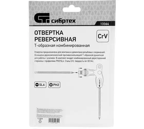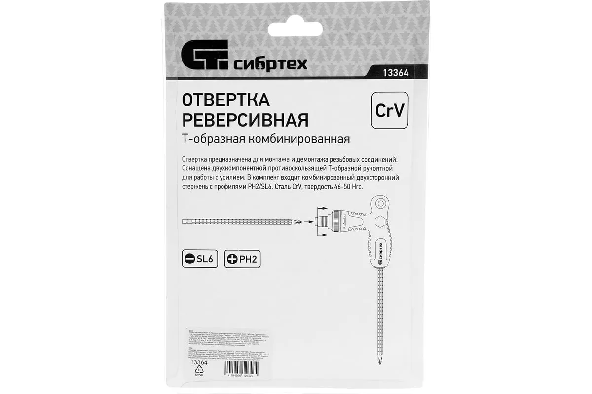 Реверсивная отвертка СИБРТЕХ Т-образная PH2/SL6 13364 представляет собой ручной инструмент с двухсторонним стержнем, который позволяет работать с крестовым и прямым шлицем. Стержень выполнен из хромованадиевой стали. Т-образная рукоятка обладает реверсивным механизмом и выполнена из двухкомпонентного материала.