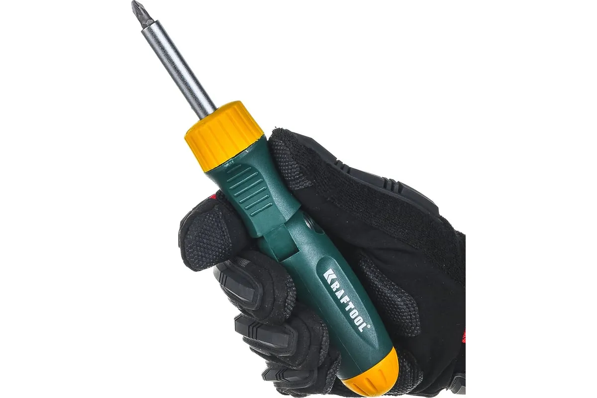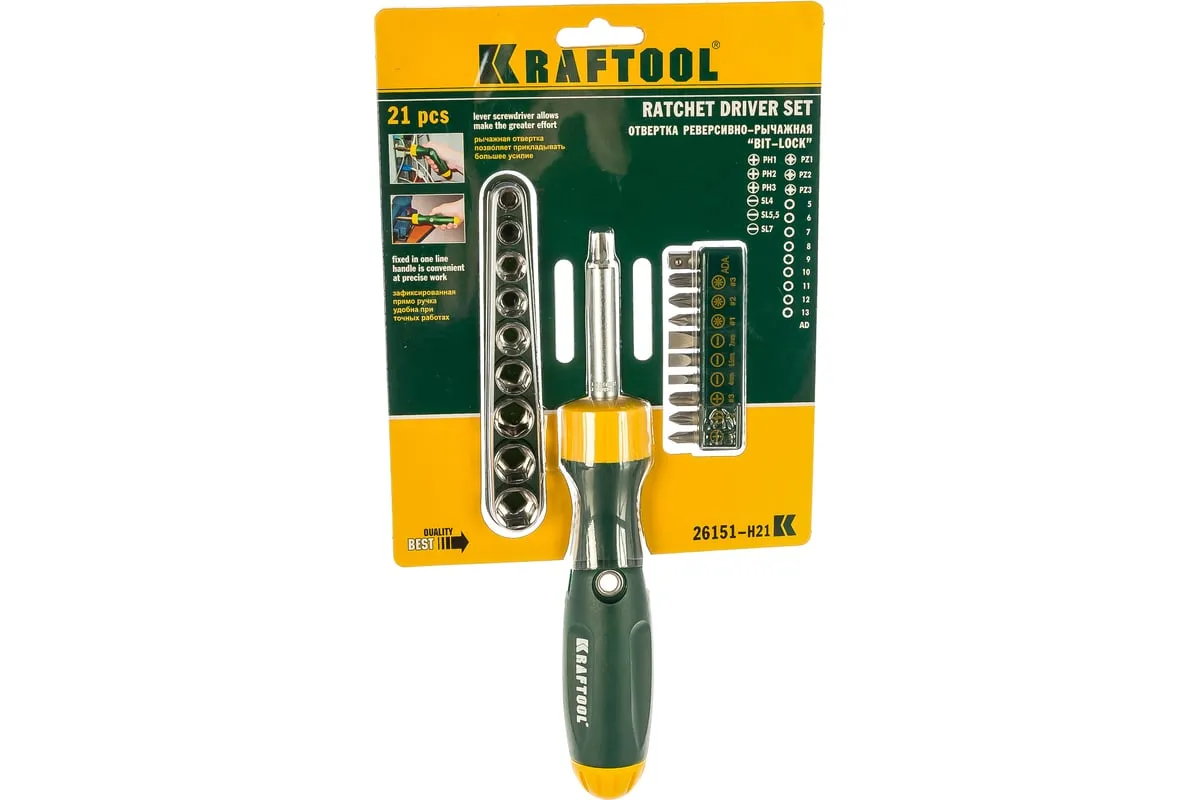 Реверсная рычажная отвертка KRAFTOOLBIT-LOCK 26151-H21 применяется для крепежных работ. За счет наличия реверсивного механизма можно закручивать и выкручивать болты, не отрывая биты от головки крепежного элемента. Поворотный шарнир используется при изменении положения ручки для эффективной передачи усилия при работе.