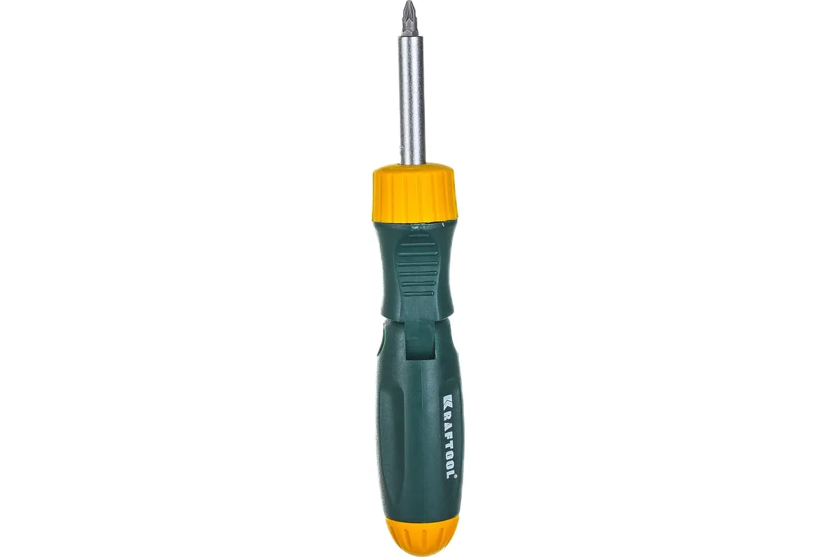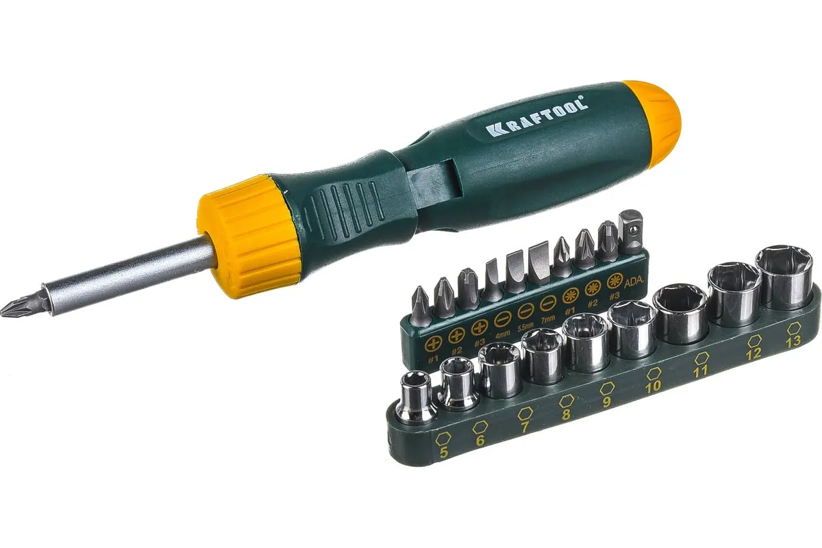 Отвертка комплектуется адаптером для головок 1/4", торцевыми головками (9 шт) и битами (10 шт).