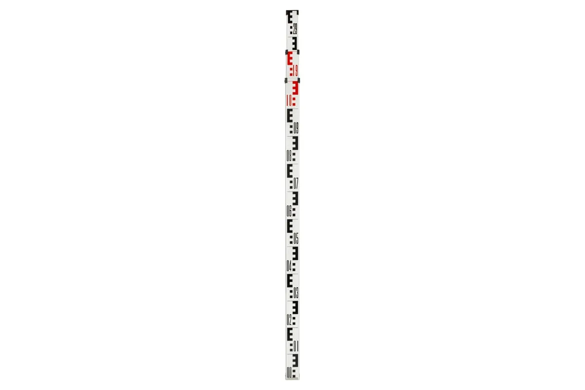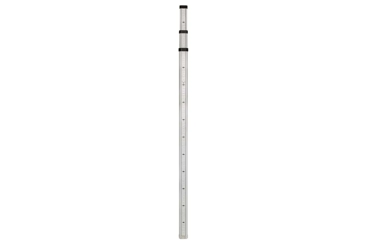 Рейка нивелирная AMO S3 состоит из трех последовательно выдвигаемых секций. Оснащена металлизированной кнопкой для фиксации секций. На рейке нанесена кроме Е-градуированной, еще и миллиметровая шкала. Для удобства работы есть пузырьковый уровень.