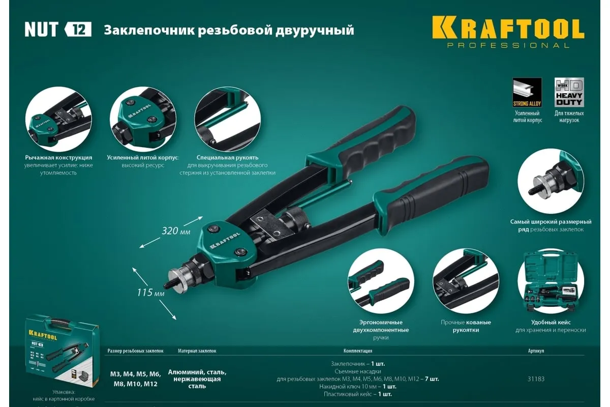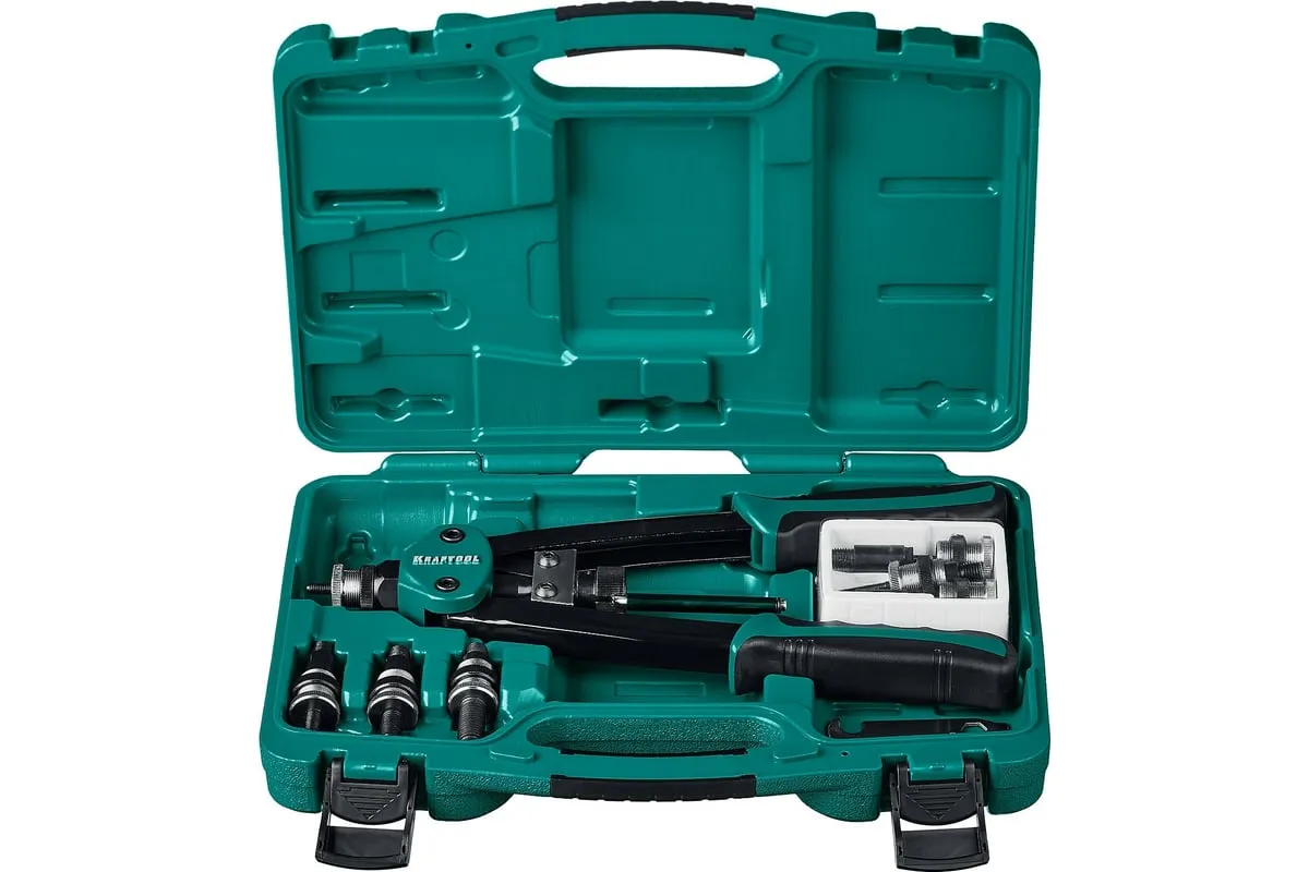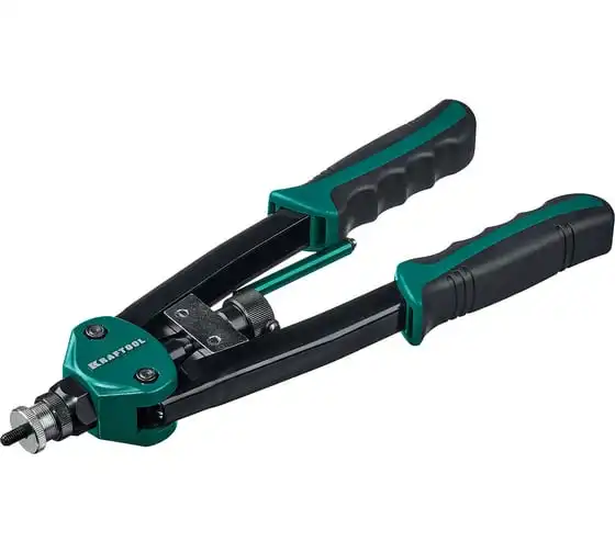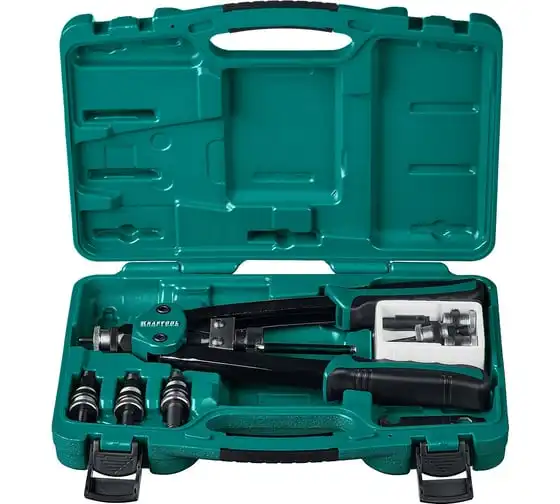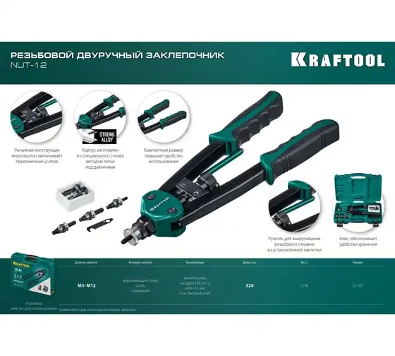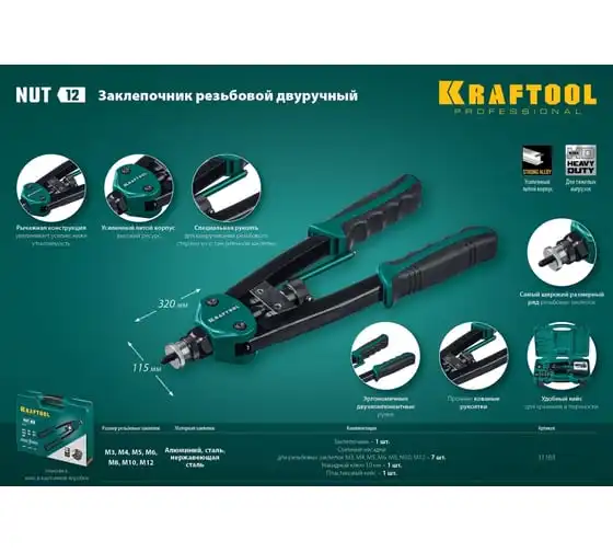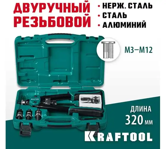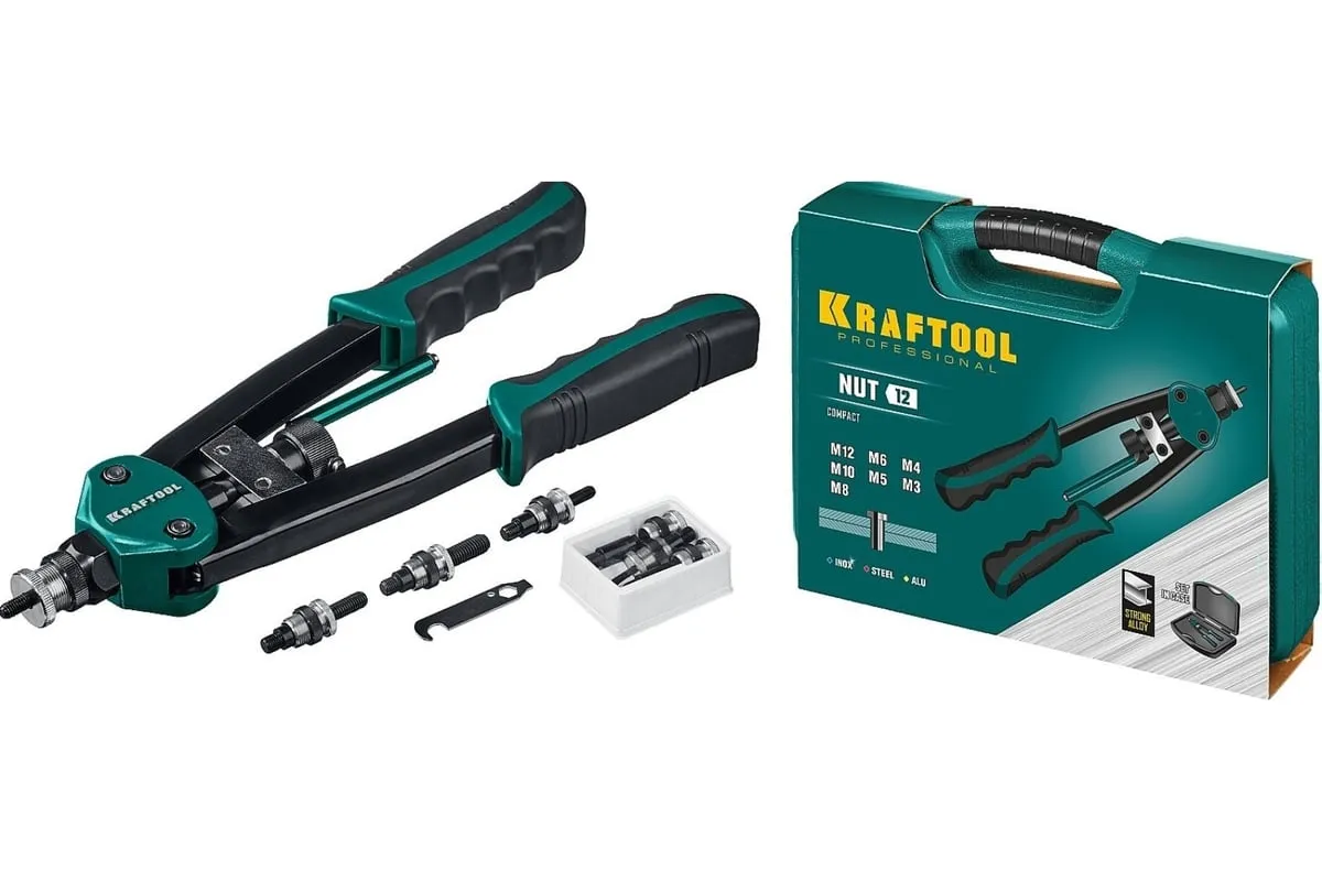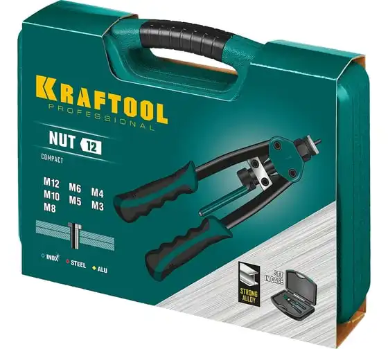 Резьбовой двуручный заклепочник KRAFTOOL Nut-12 М3-М12, в кейсе 31183 выдерживает высокие рабочие нагрузки и предназначен для установки резьбовых заклепок из алюминия, стали и нержавеющей стали. Заклепка установлена, когда образовался бортик. Дальнейшее вытягивание приводит к поломке насадок.