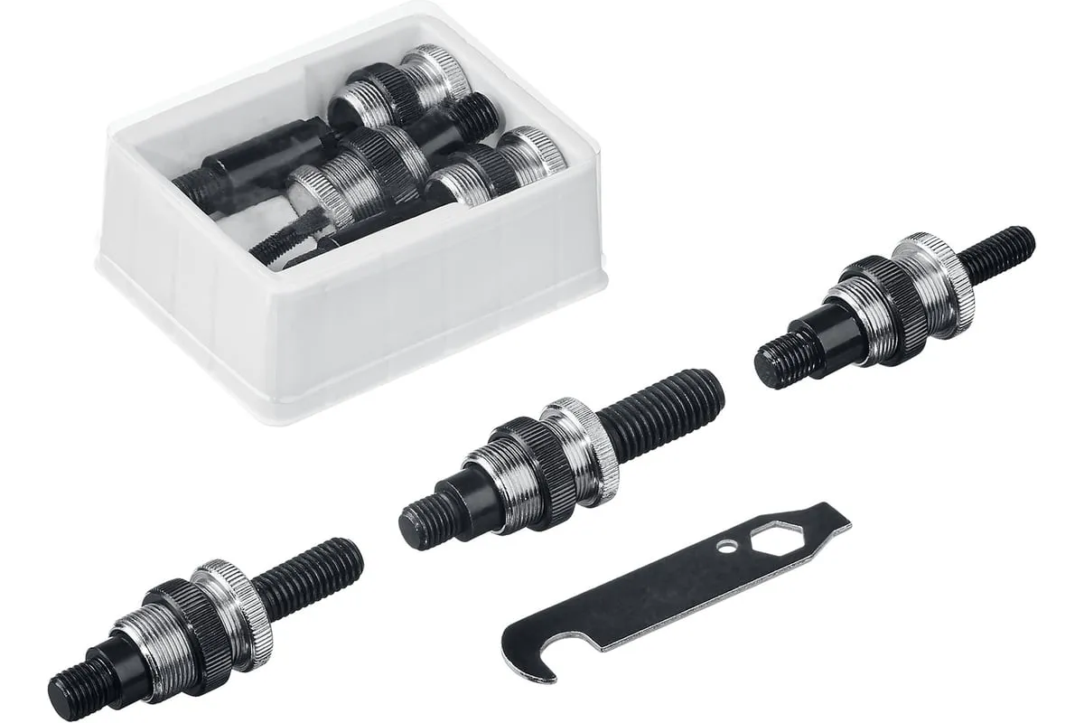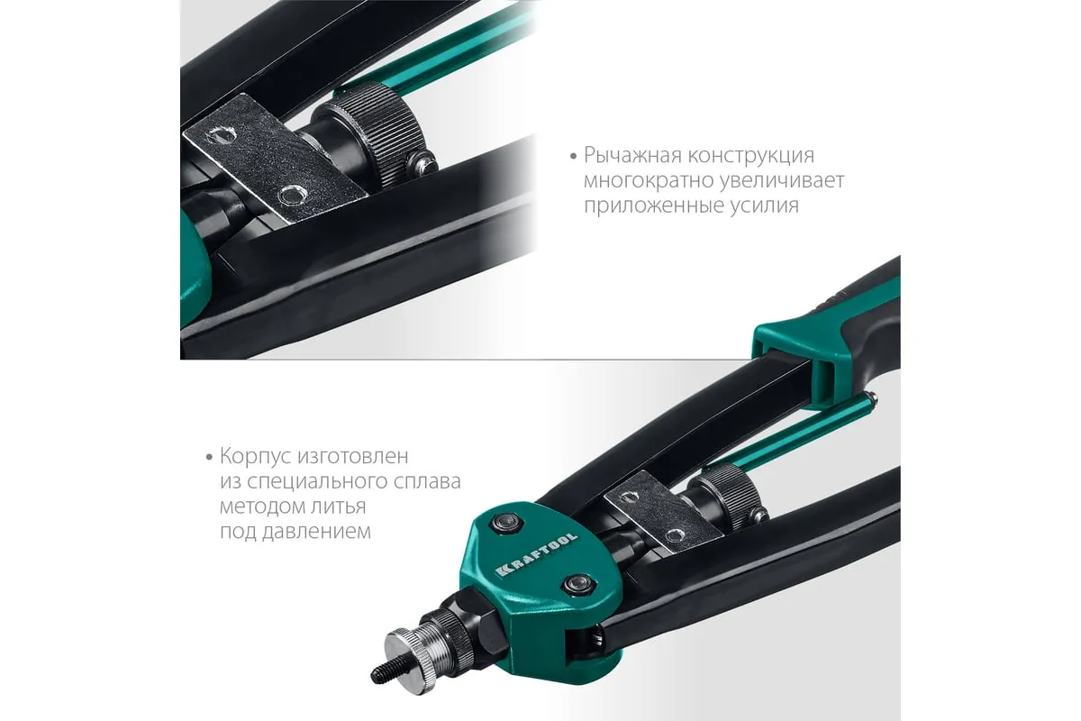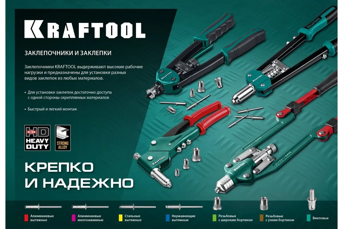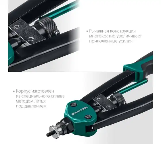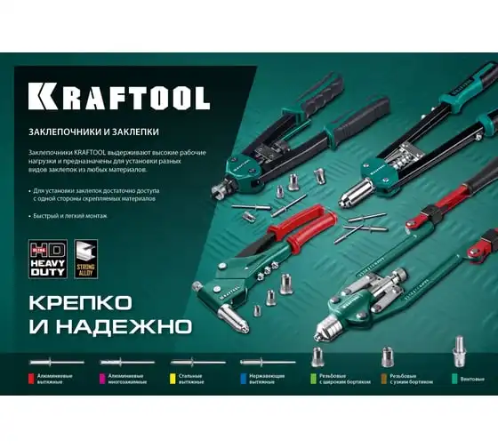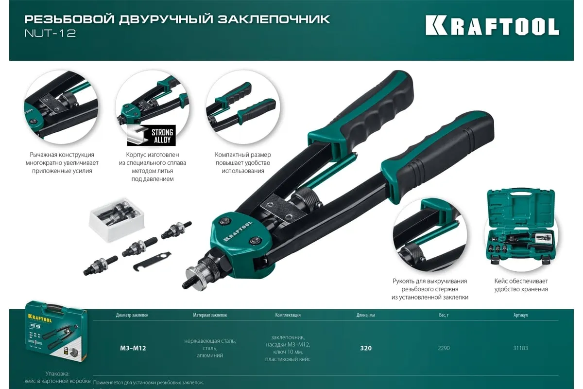 Резьбовой двуручный заклепочник KRAFTOOL Nut-12 М3-М12, в кейсе 31183 выдерживает высокие рабочие нагрузки и предназначен для установки резьбовых заклепок из алюминия, стали и нержавеющей стали. Заклепка установлена, когда образовался бортик. Дальнейшее вытягивание приводит к поломке насадок.