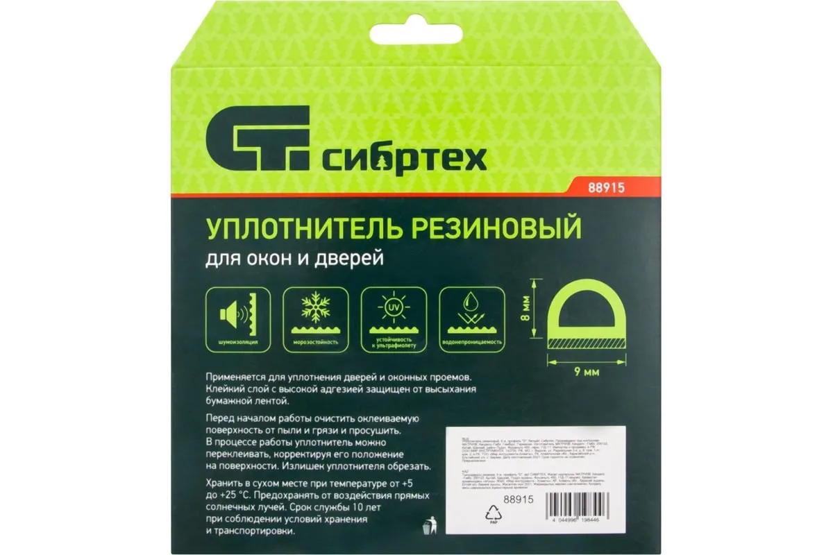 Белый резиновый уплотнитель Сибртех 88915 длиной 6 м, профиль «D», предназначен для герметизации и уплотнения оконных и дверных блоков с целью исключения сквозняков и вибраций, защиты от влаги и пыли, создания эффективной тепло- и звукоизоляции. Изделие снижает энергетические и экономические затраты. D профиль 9 x 8 мм подойдет для щелей размером 3-7 мм.