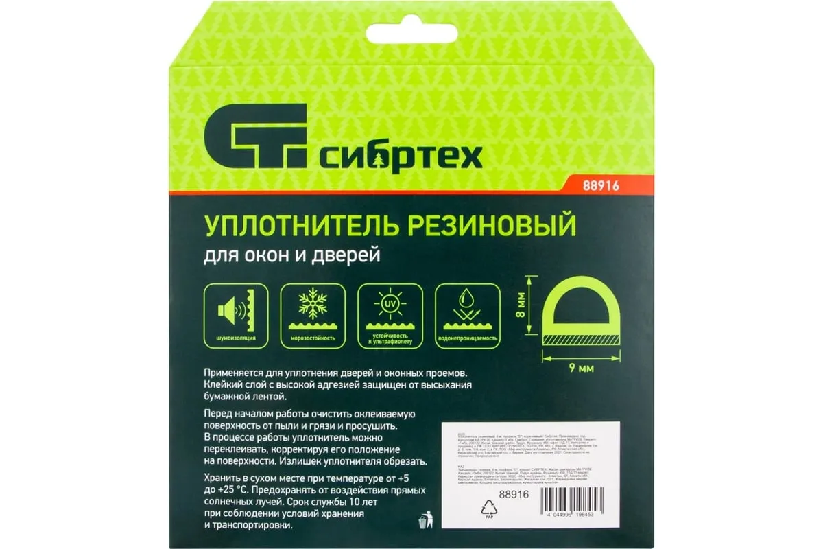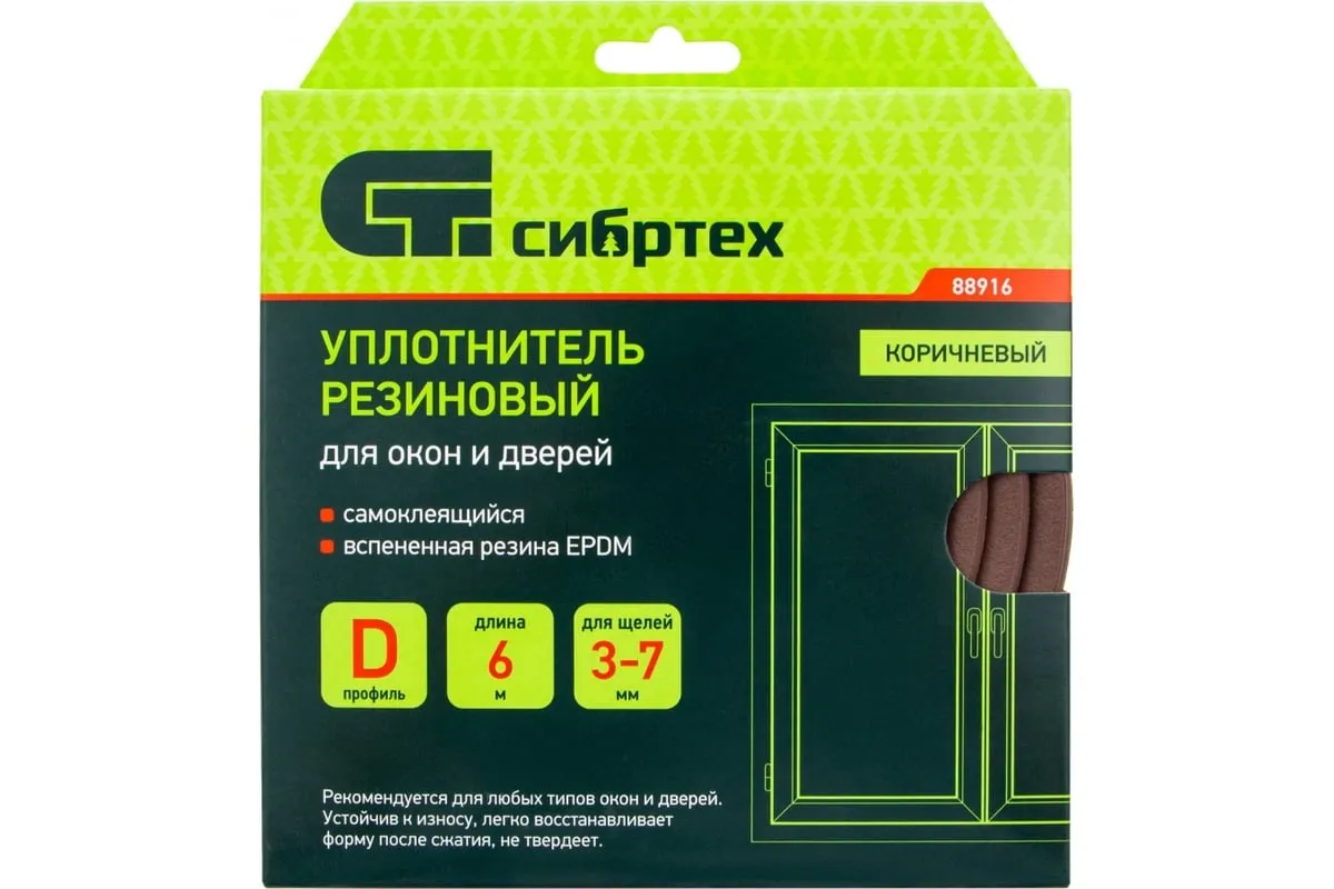 Коричневый резиновый уплотнитель Сибртех 88916 длиной 6 м, профиль «D», предназначен для герметизации и уплотнения оконных и дверных блоков с целью исключения сквозняков и вибраций, защиты от влаги и пыли, создания эффективной тепло- и звукоизоляции. Изделие снижает энергетические и экономические затраты. D профиль 9 x 8 мм подойдет для щелей размером 3-7 мм.