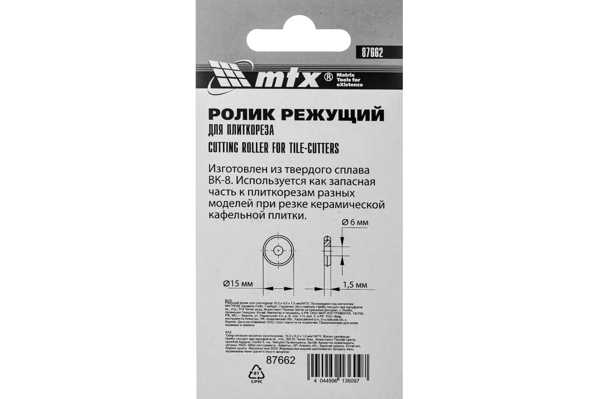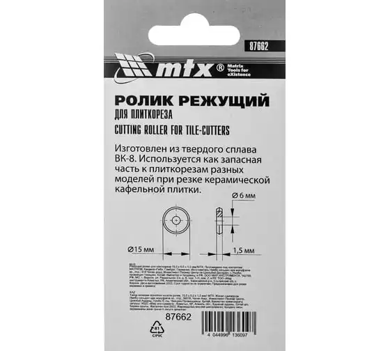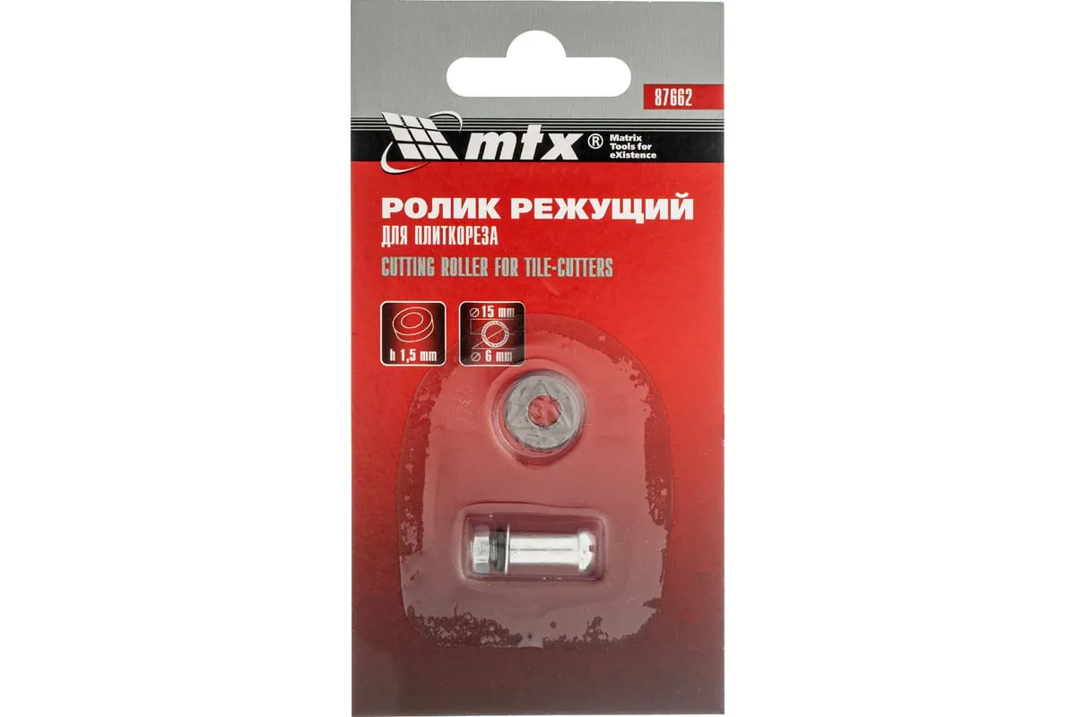 Режущий ролик MTX 87662 размером 15,0 х 6,0 х 1,5 мм совместим с плиткорезами MTX 87613-876255. Используется для резки керамической плитки, будет полезен во время проведения облицовочных работ.