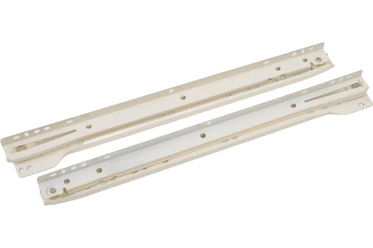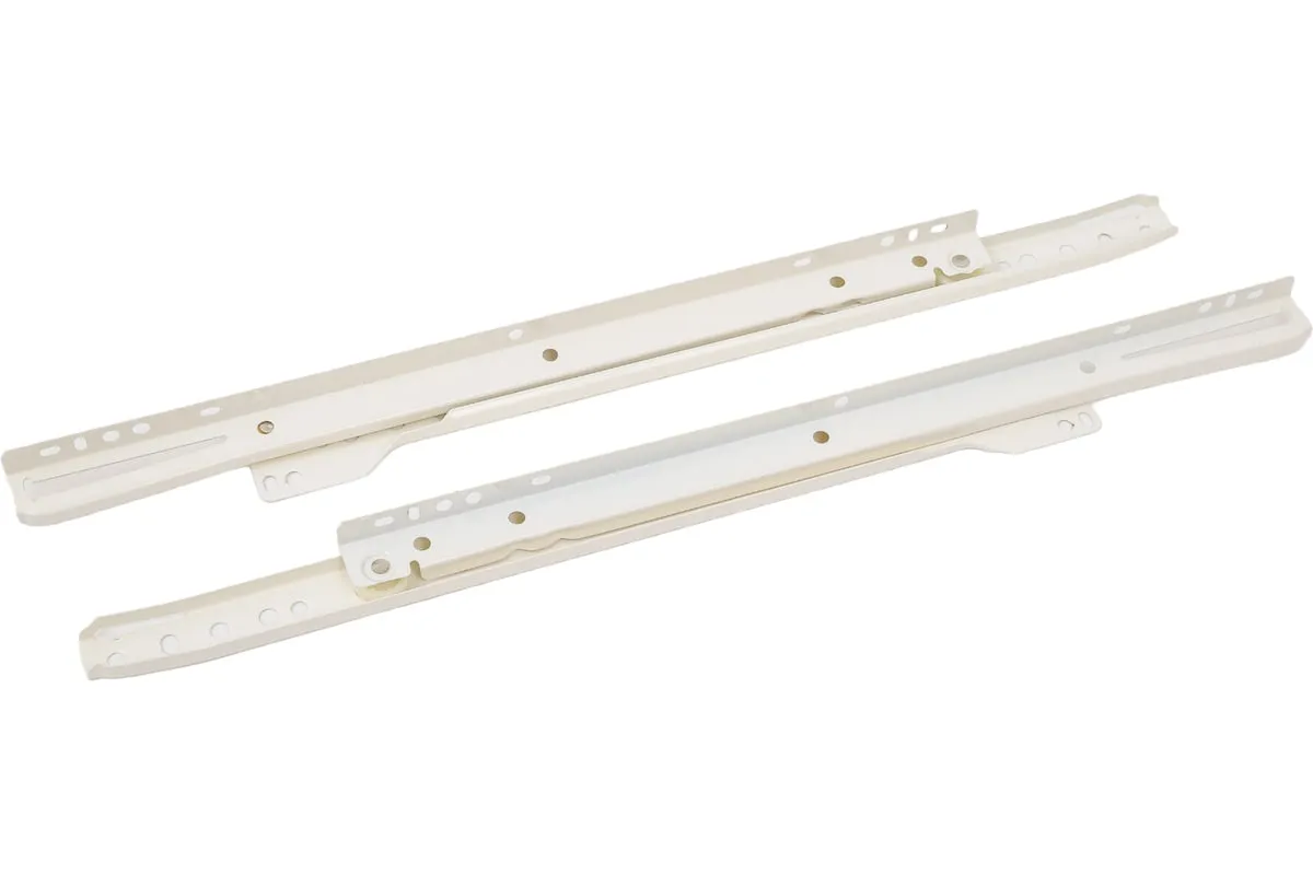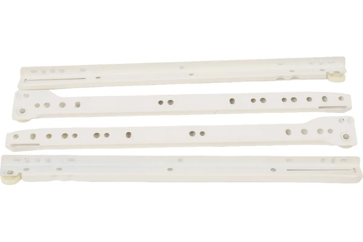 Роликовая направляющая STARFIX DS10 350 мм, белая, 2 шт. SMF-10147 состоит из двух частей: одна часть жестко крепится на выдвижном элементе, а другая на каркасе шкафа. Выдвижение происходит за счет пластиковых роликов, перемежающихся в специальных пазах.