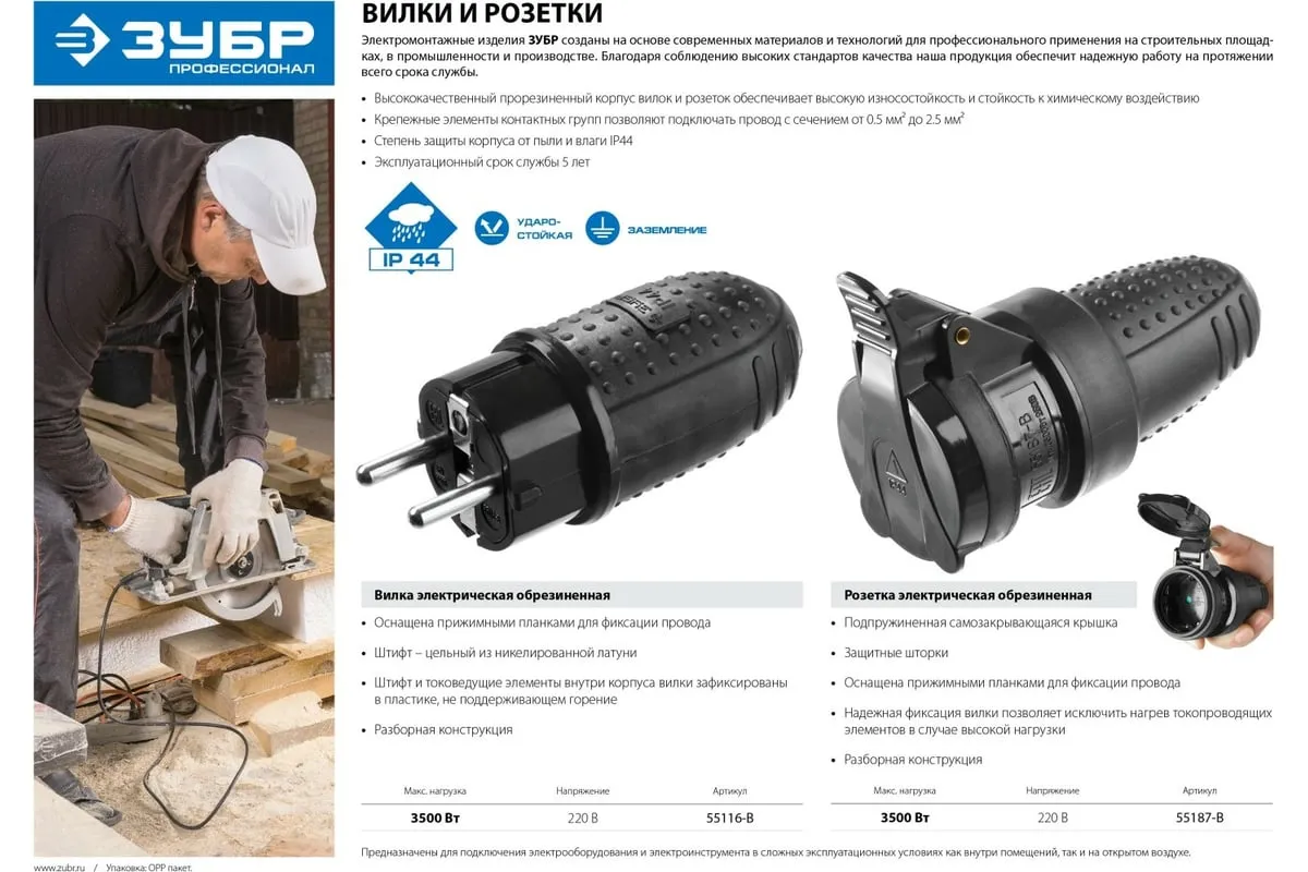 Штепсельные вилки и гнезда являются частью соединения, которое обеспечивает подключение электроприбора к розетке. Применяются в основном при ремонте различного электрооборудования — когда требуется заменить вышедшую из строя штепсельную вилку или гнездо. Розетка электрическая ударопрочная ЗУБР Профессионал, с заземлением, с защитными шторками, с крышкой, 16А/220 В, IP44, черная служит для присоединения к сети электропитания различных бытовых электроприборов мощностью до 3,5 кВт. Изделие предназначено для эксплуатации в суровых условиях - на открытом воздухе или во влажных или запыленных помещениях, например: на дачном участке, на строительных площадках и пр.