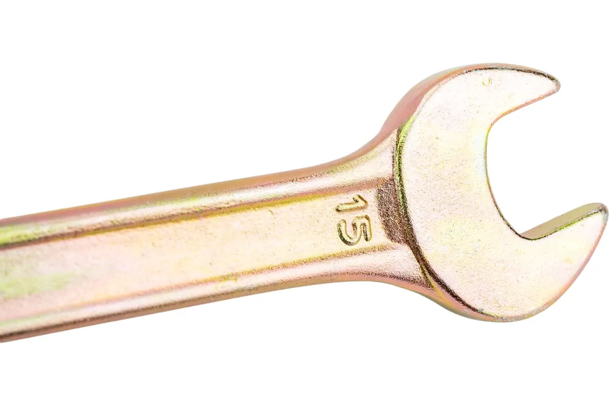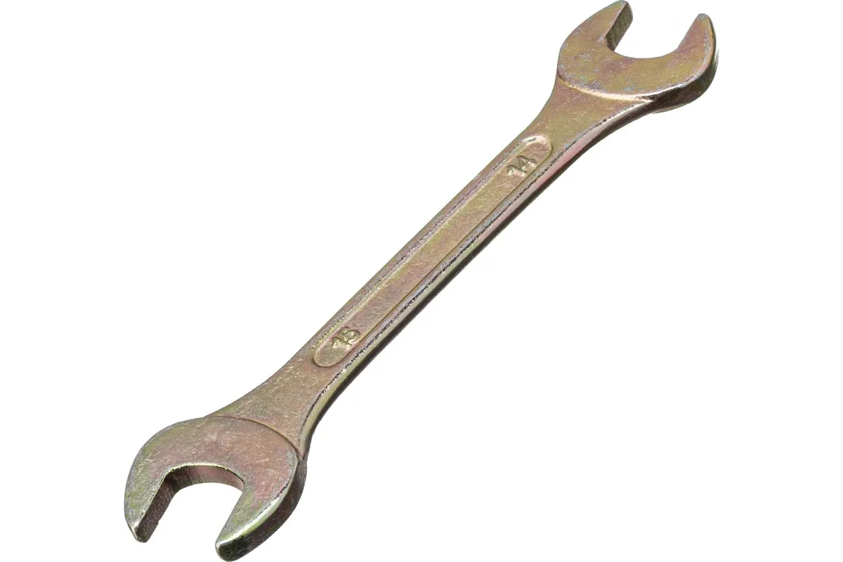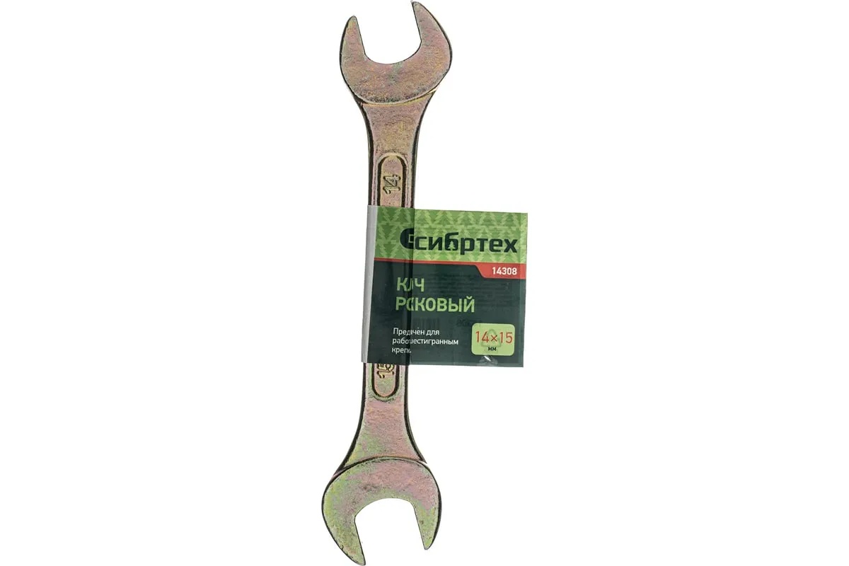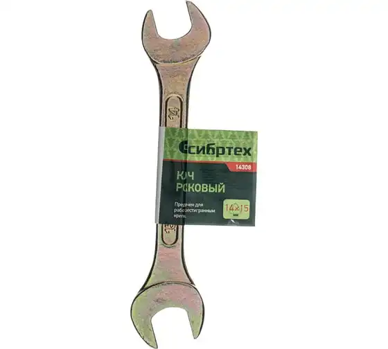 Рожковый ключ Сибртех 14308 с покрытием из желтого цинка имеет две рабочие части с размером зева 14 и 15 мм и предназначен для закручивания и откручивания резьбовых крепежей с шестигранными головками. Губки расположены под небольшим углом к оси тела ключа, что повышает удобство работы в ограниченном пространстве. Инструмент пригодится для проведения монтажных работ, сборки и разборки оборудования, ремонта техники, а также будет полезен в быту.