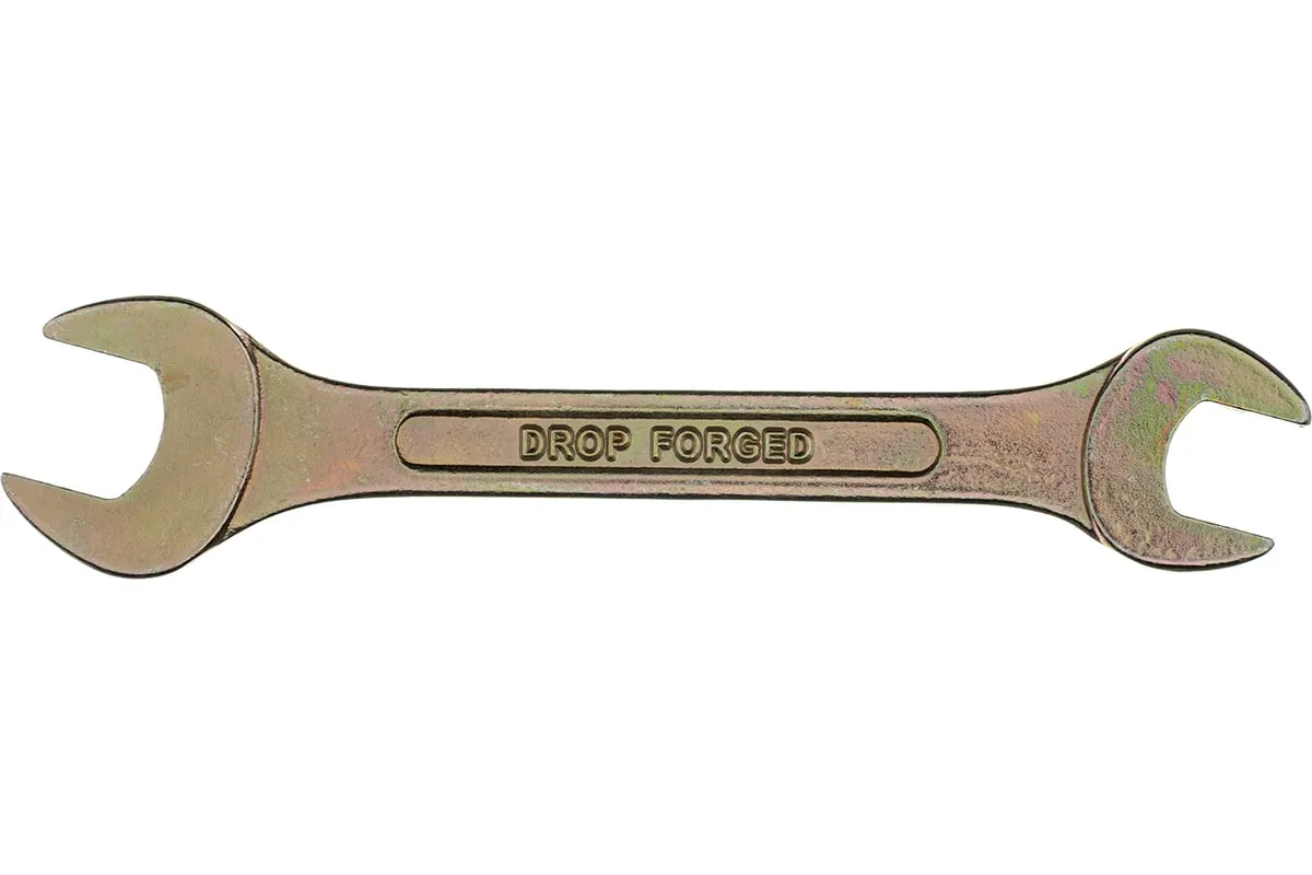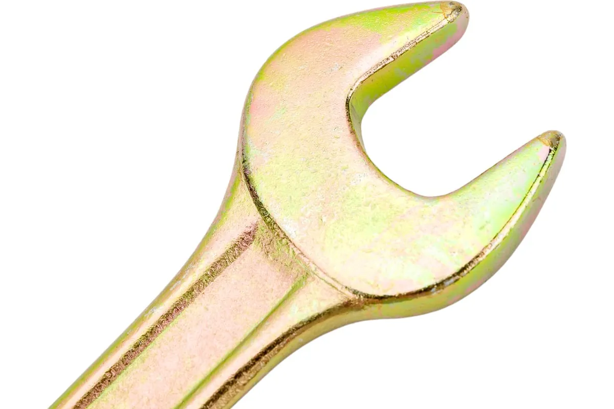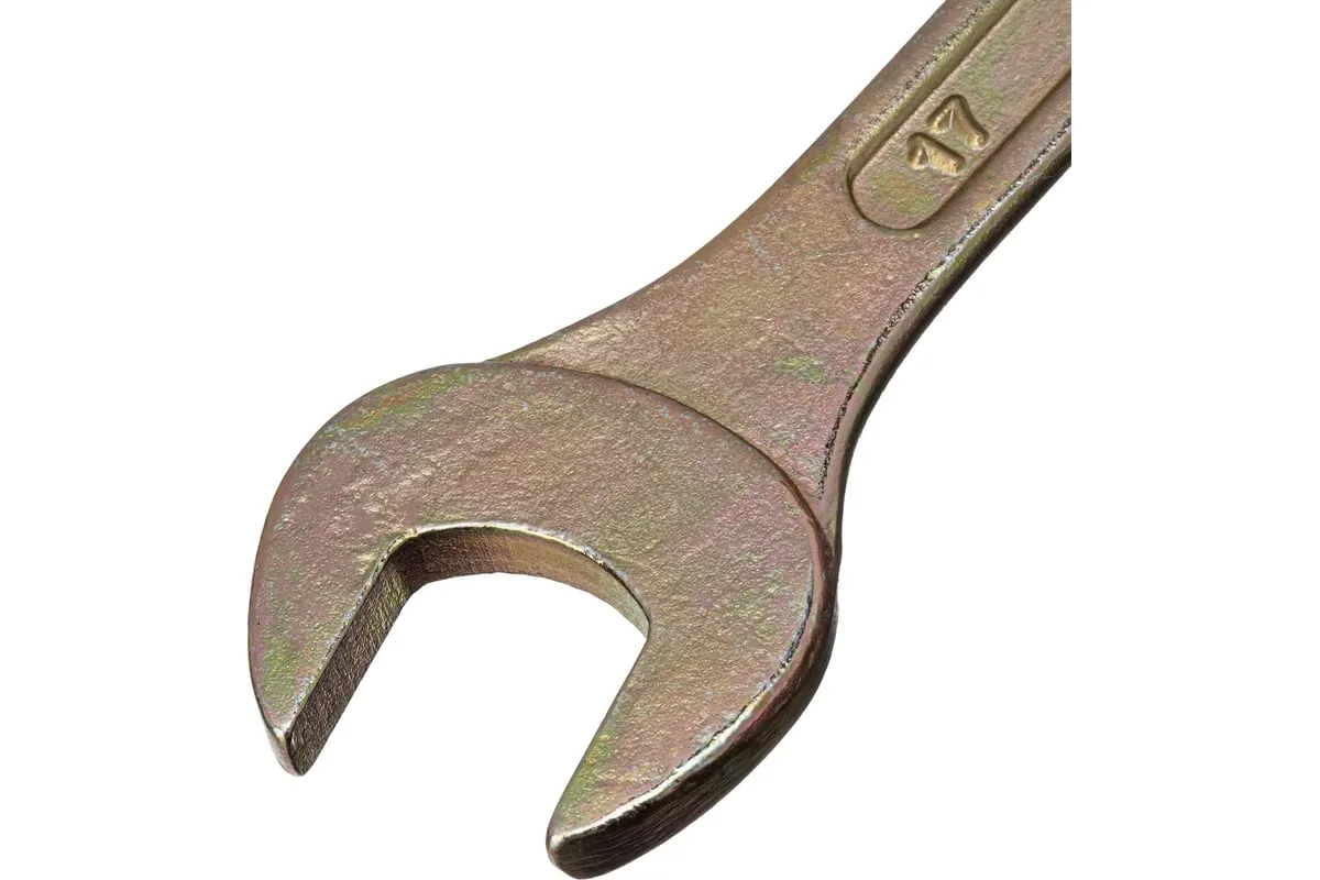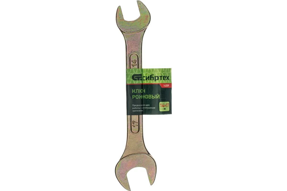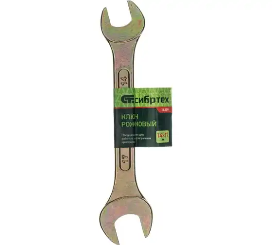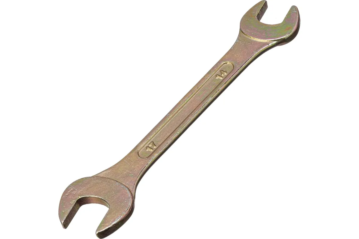 Рожковый ключ Сибртех 14309, 14 х 17 мм, с покрытием из желтого цинка, предназначен для закручивания и откручивания резьбовых крепежей с шестигранными головками. Имеет две рожковые части с размером зева 14 и 17 мм. Губки расположены под небольшим углом к оси тела ключа, что повышает удобство работы в ограниченном пространстве. Инструмент пригодится при проведении монтажных работ, сборке и разборке оборудования, для ремонта техники, а также будет полезен в быту.