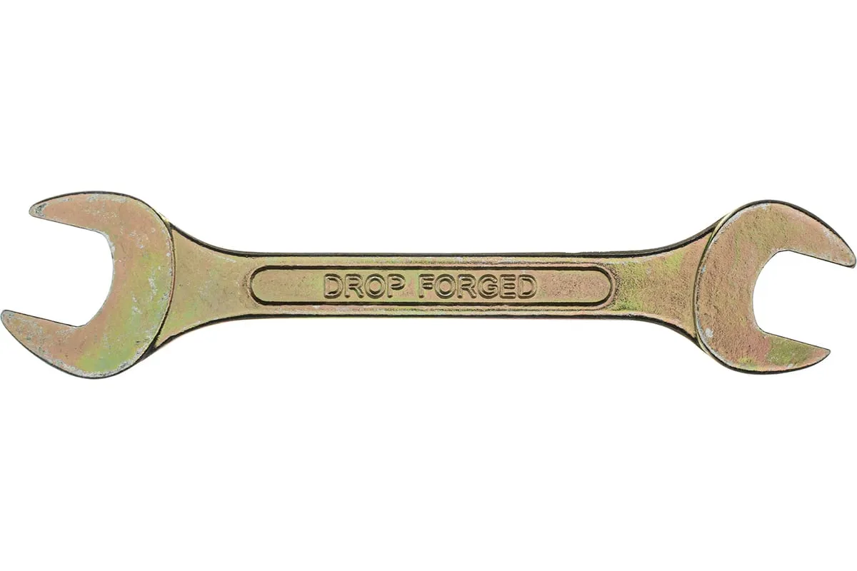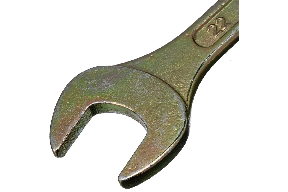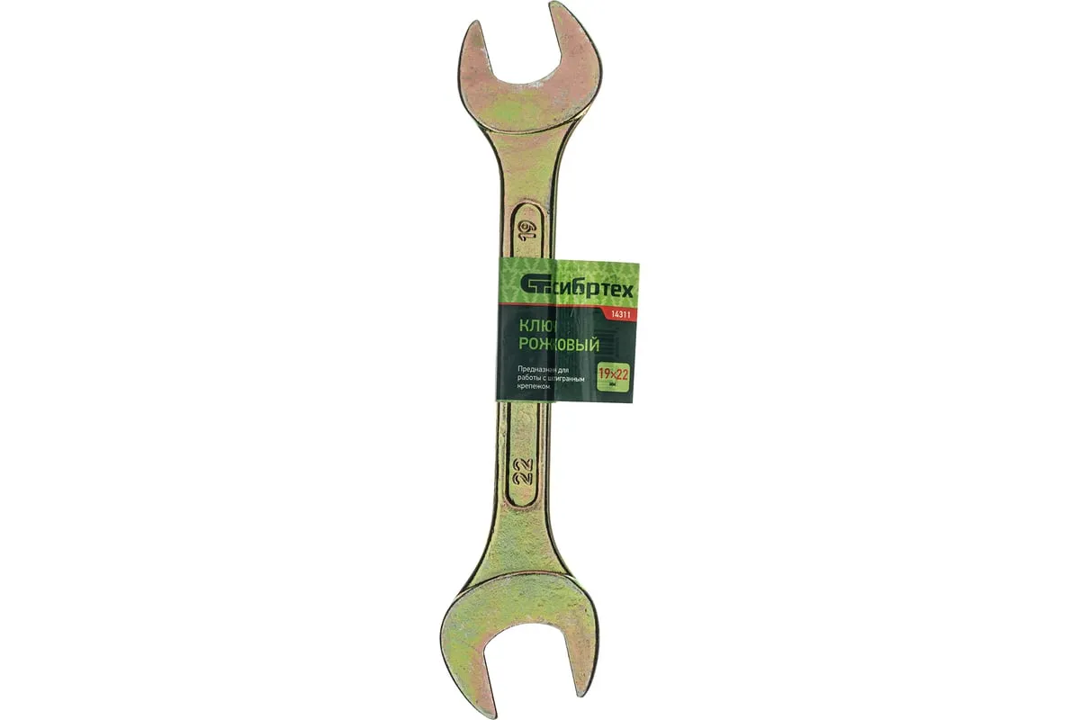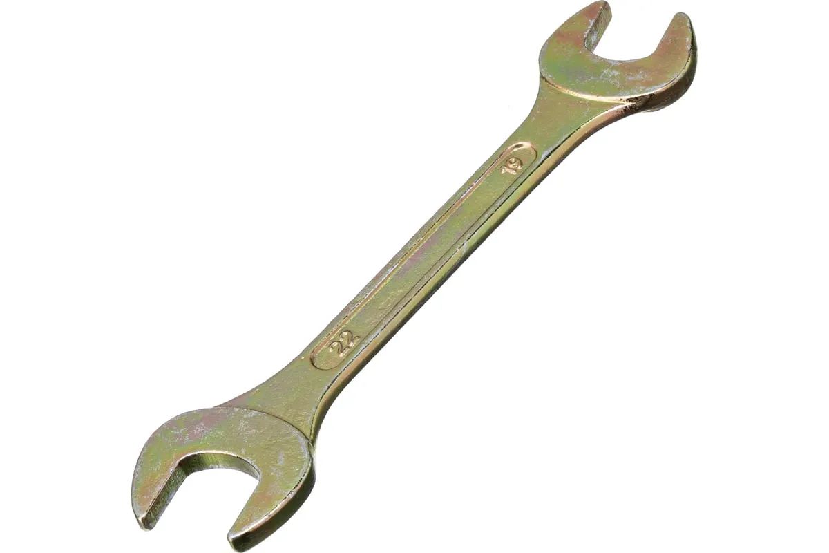 Рожковый ключ Сибртех 14311 с покрытием из желтого цинка имеет две рабочие части с размером зева 19 и 22 мм и предназначен для закручивания и откручивания резьбовых крепежей с шестигранными головками. Губки расположены под небольшим углом к оси тела ключа, что повышает удобство работы в ограниченном пространстве. Инструмент пригодится для проведения монтажных работ, сборки и разборки оборудования, ремонта техники, а также будет полезен в быту.