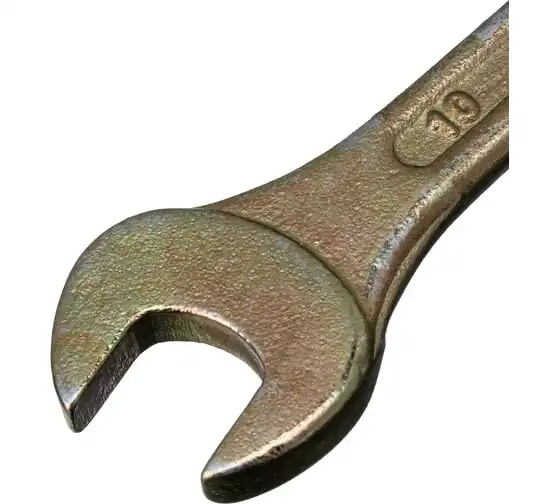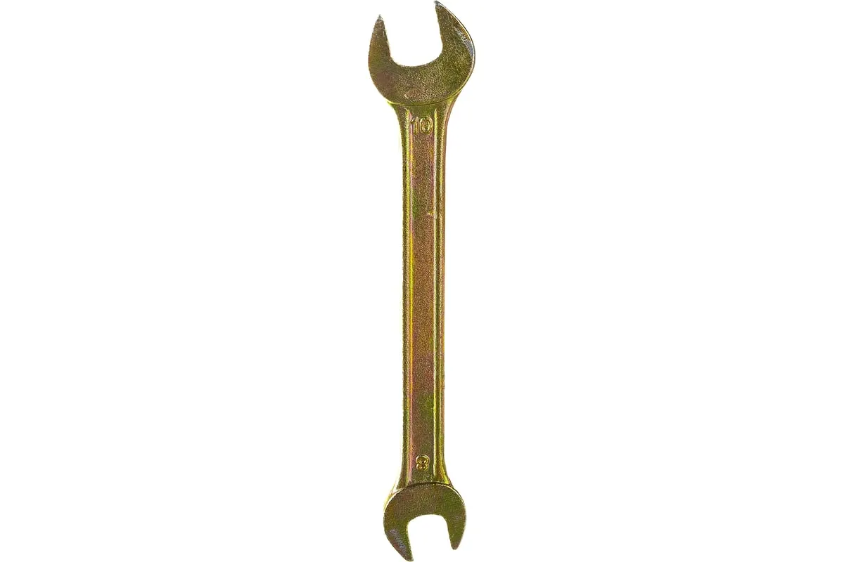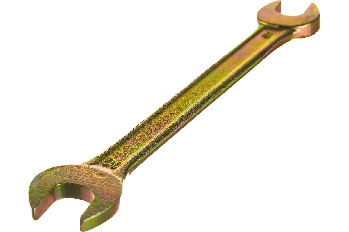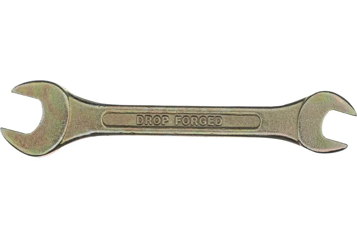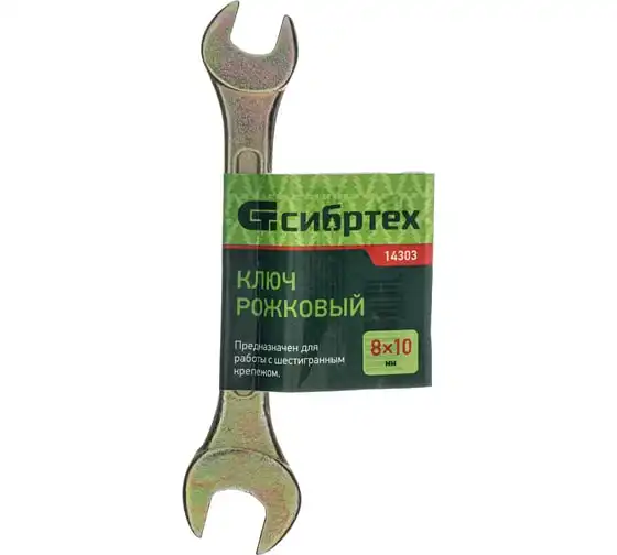 Рожковый ключ Сибртех 14303, 8 х 10 мм, с покрытием из желтого цинка, предназначен для закручивания и откручивания резьбовых крепежей с шестигранными головками. Имеет две рожковые части с размером зева 8 и 10 мм. Губки расположены под небольшим углом к оси тела ключа, что повышает удобство работы в ограниченном пространстве. Инструмент пригодится при проведении монтажных работ, сборке и разборке оборудования, для ремонта техники, а также будет полезен в быту.