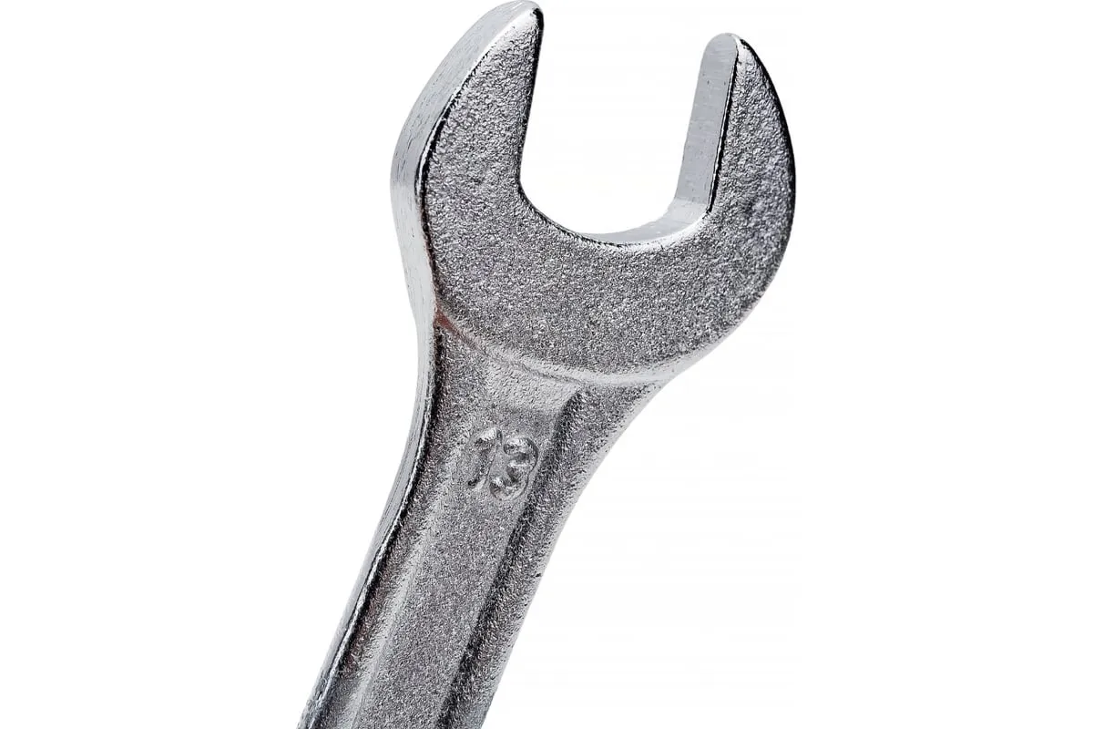 Хромированный рожковый ключ предназначен для откручивания и закручивания болтов, гаек и других крепежей с шестигранным профилем. Рабочие губки имеются с двух сторон, размер зева составляет 12 и 13 мм. Губки расположены под углом к рукоятке, что облегчает работу в стесненных условиях. Инструмент используется для сборки и разборки оборудования, при проведении монтажных работ, будет полезен дома, на даче или в гараже.