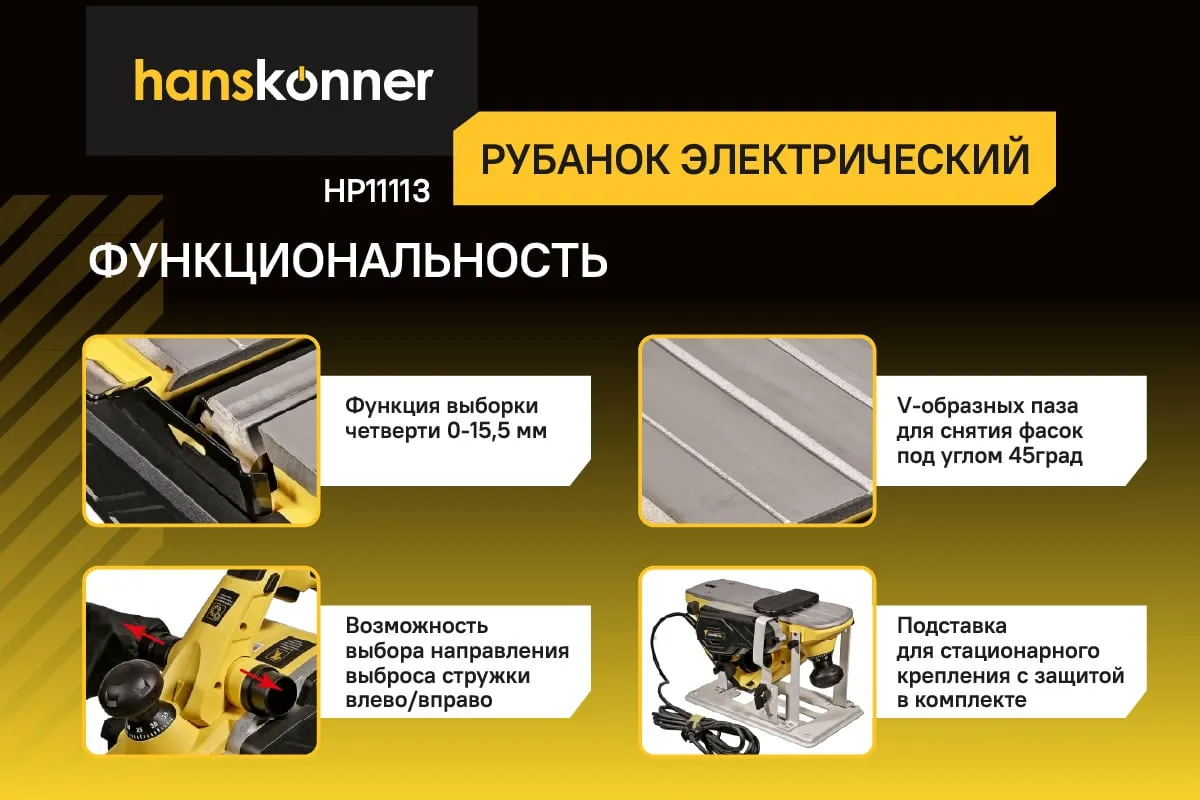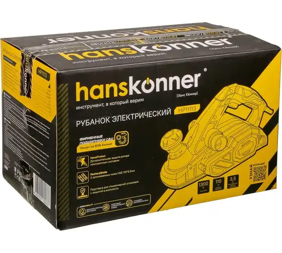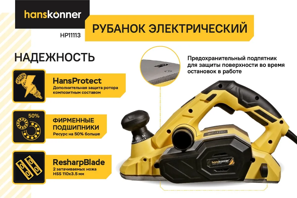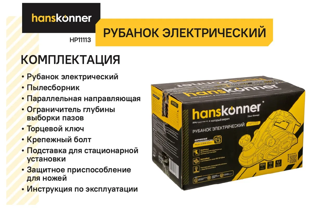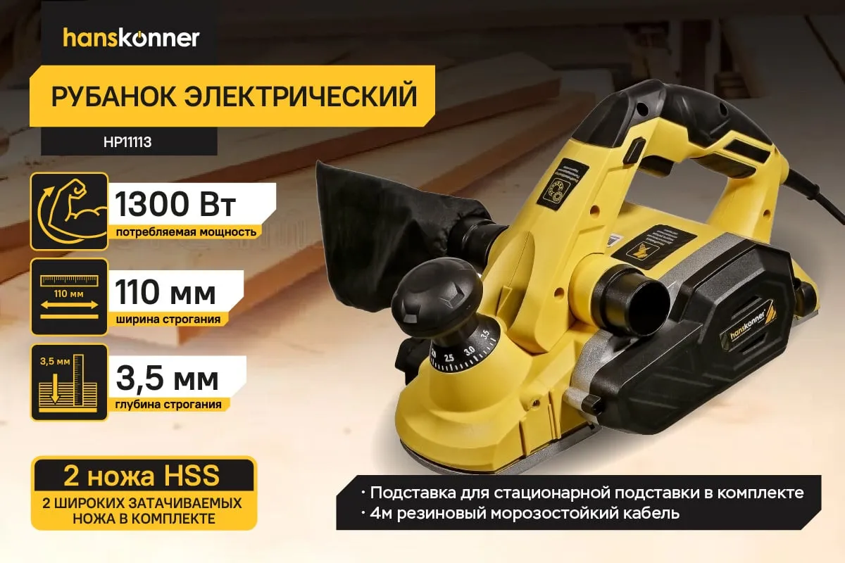Рубанок H11113 служит для обработки древесины любых пород.Подходит для строгания заготовок шириной до 110 мм.Функционал рубанка предусматривает возможность выборки четверти в диапазоне до 15,5мм, а направляющие пазы на подошве позволяют снимать фаску.Комплект поставки включает подставку для стационарного крепления при этом значительно расширяя возможности инструмента.Рубанок укомплектован 4м кабелем питания PVC с липучкой-фиксатором, гарантируя пользователю мобильность при работе.Данная модель имеет дополнительную защиту ротора композитным составом по технологии HansProtect.,что позволяет увеличить срок службы инструмента.