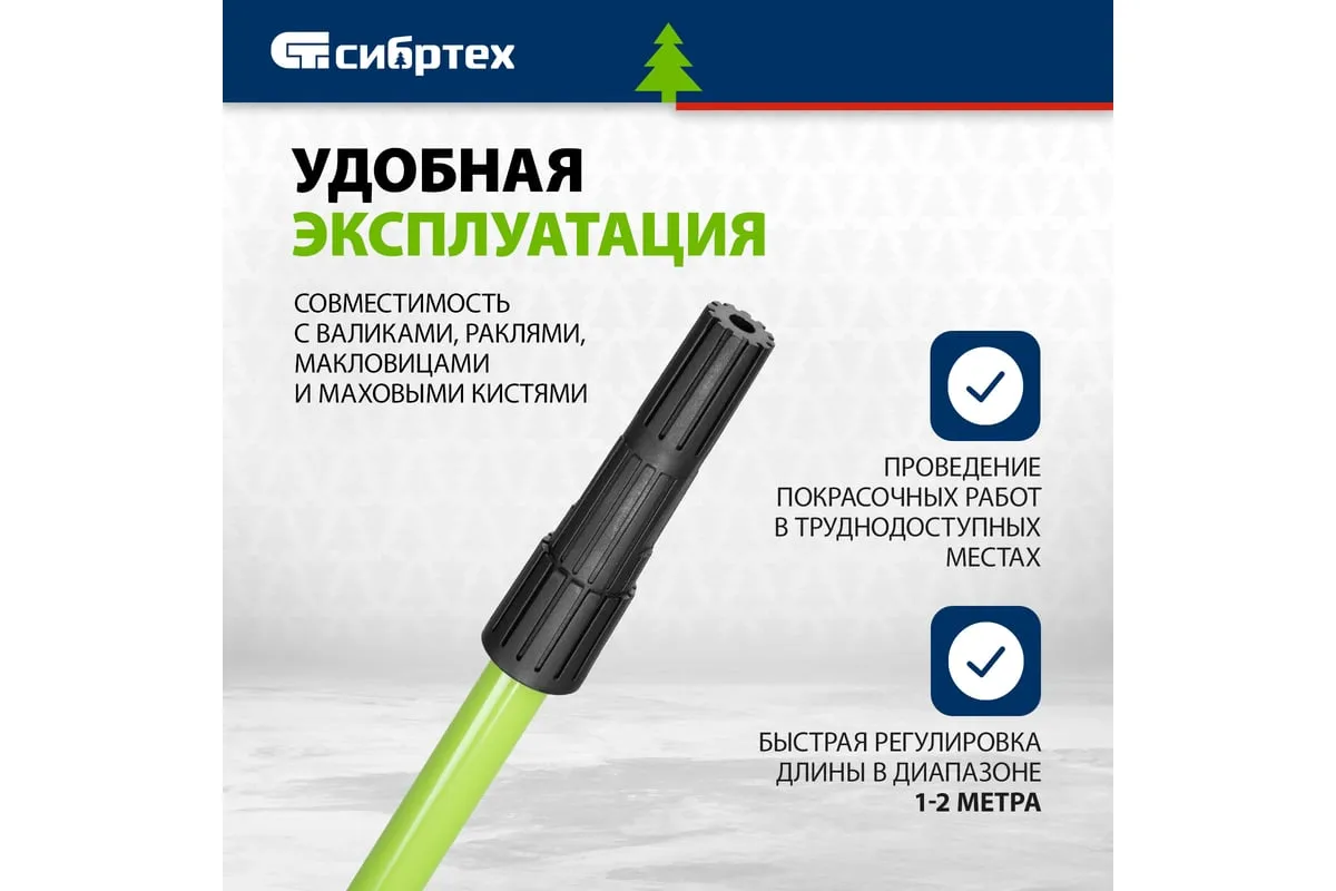 Телескопическая металлическая ручка Сибртех 81247 регулируется по длине в диапазоне 1-2 м и используется для проведения малярно-отделочных работ: окрашивания высоких стен и потолков, прокатки обоев. Совместима не только с валиками, но и с маховыми кистями, раклями и макловицами, что расширяет возможности ее применения.