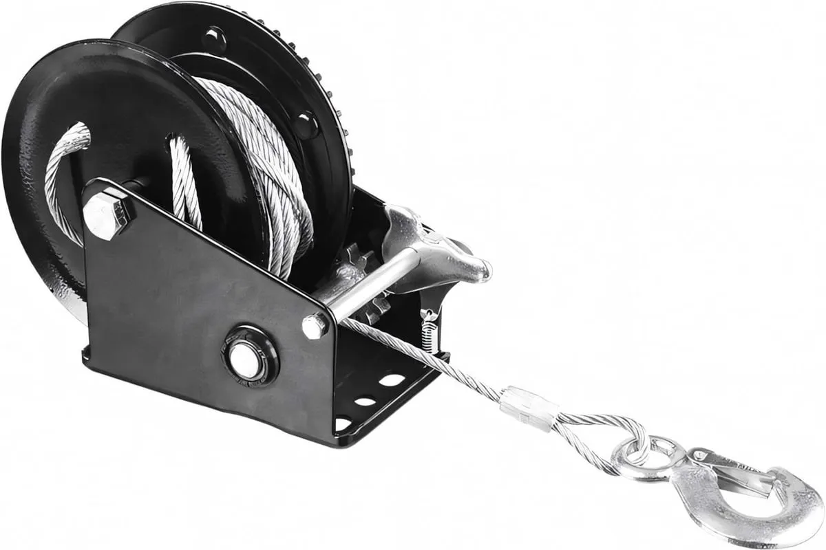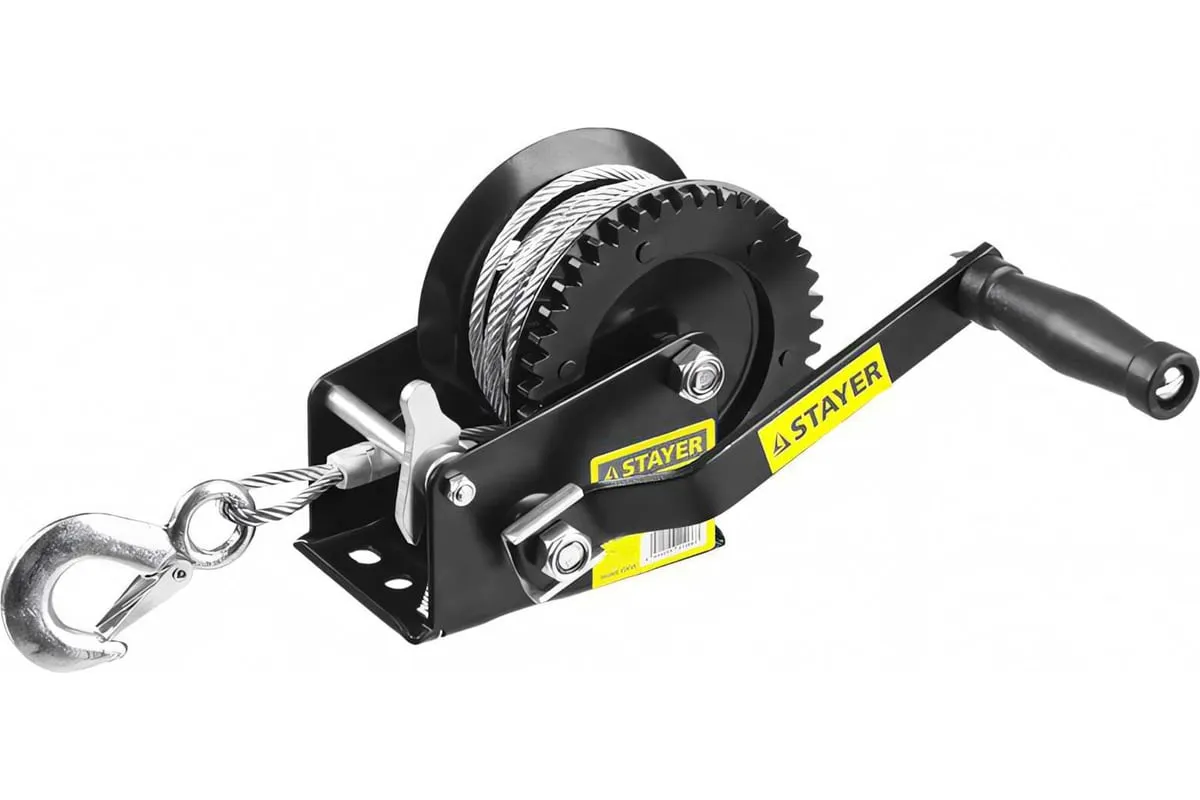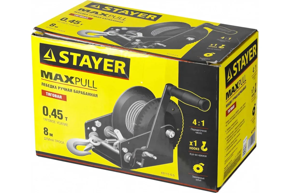 Ручная барабанная лебедка Stayer MASTER 0,45т, 8м 43112-0.5 оснащена тросом длиной 8 м и крюком, с помощью которого груз закрепляется и перемещается. Конструкция обладает рукояткой для наматывания троса на барабан. Лебедка удобна для проведения ремонтных и строительных работ. Крюк оснащен предохранительной защелкой, он выполнен из углеродистой стали.