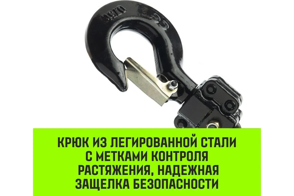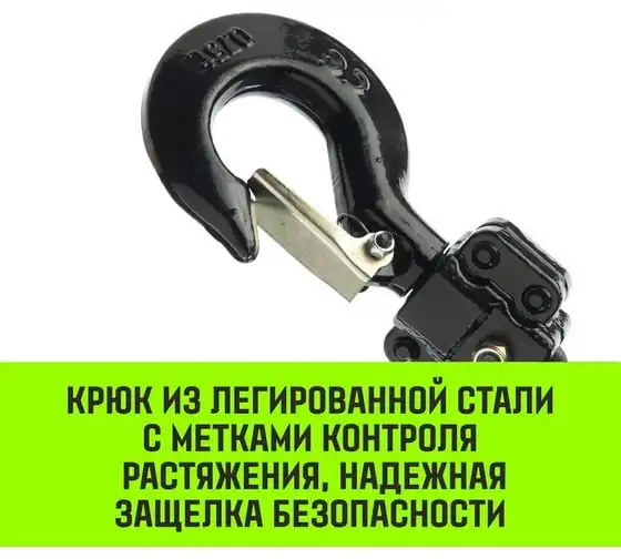 Конструкция крюков, изготовленных из легированной стали с метками контроля растяжения позволяет при чрезмерной нагрузке не разрушаться, а постепенно растягиваться, тем самым указывая на перегруз. Надежную работу обеспечивают надежные защелки безопасности закрепленные у основания. Подъемник имеет одну из самых надежных тормозных систем на рынке. Функция защиты в режиме свободного хода: если груз начинает резко падать, тормоз подъемника срабатывает мгновенно.