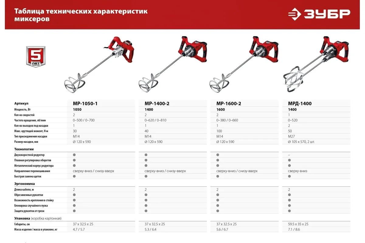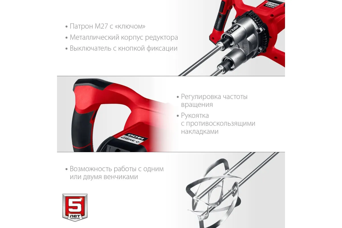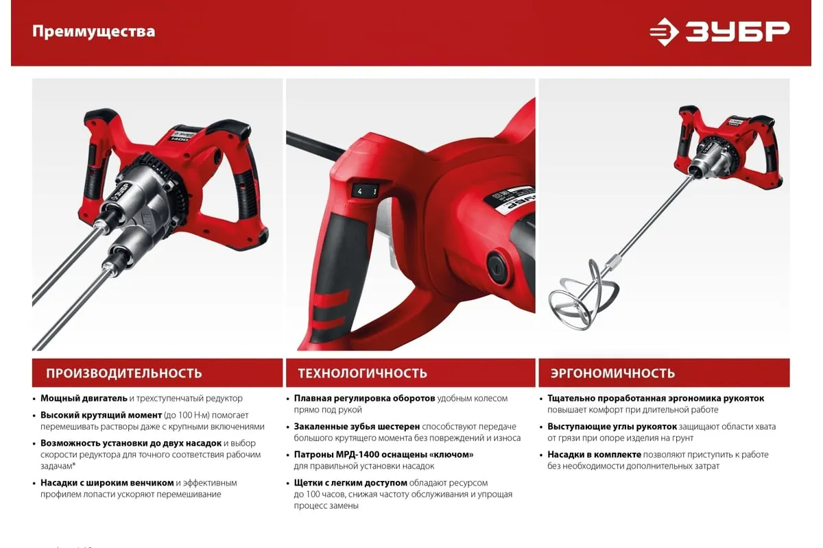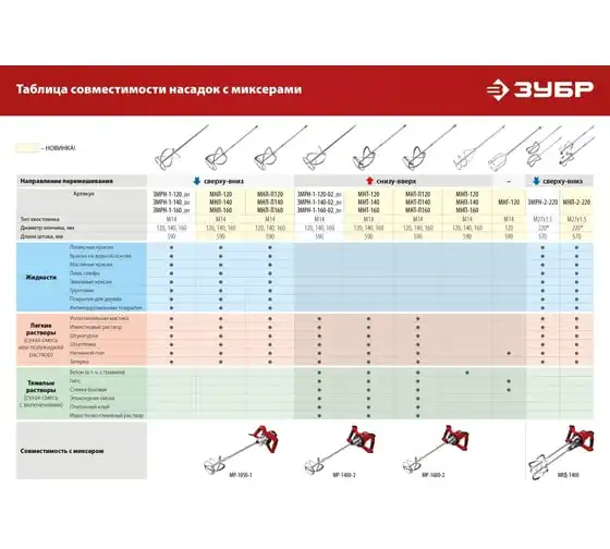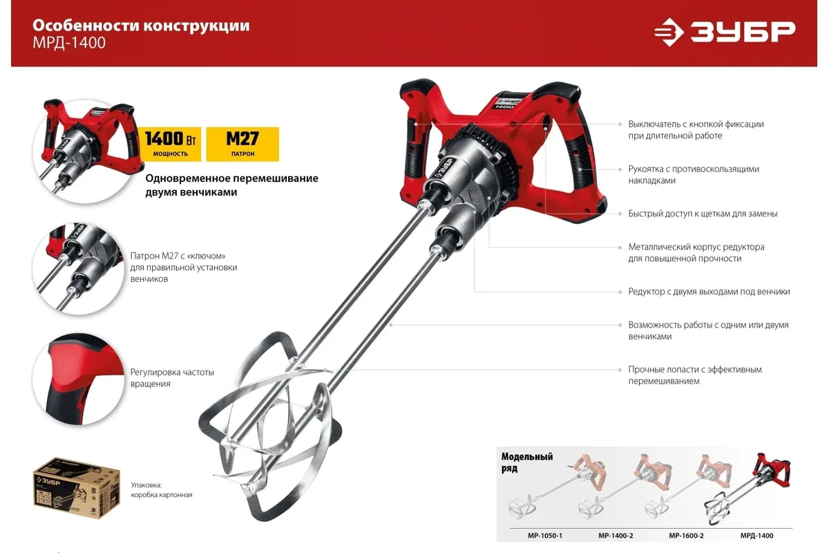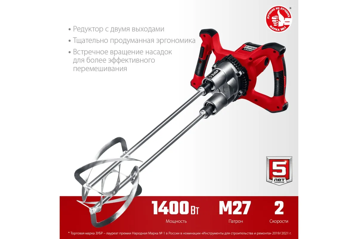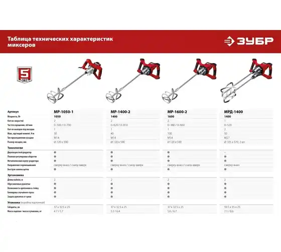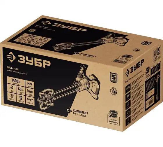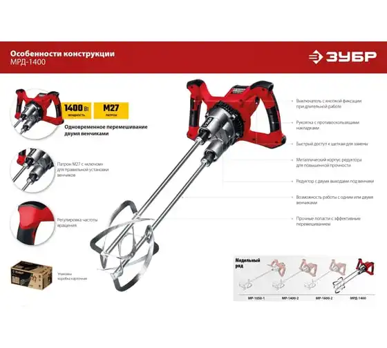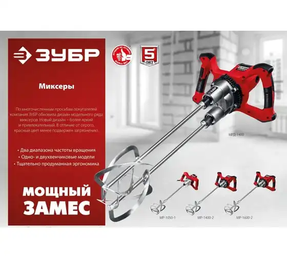 Ручной электрический миксер ЗУБР МРД-1400 подходит для перемешивания различных строительных материалов: бетона, штукатурки, плиточных и обойных клеев и т.д. Благодаря мощному двигателю и высокому крутящему моменту можно работать даже с тяжелыми смесями.