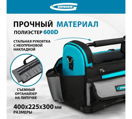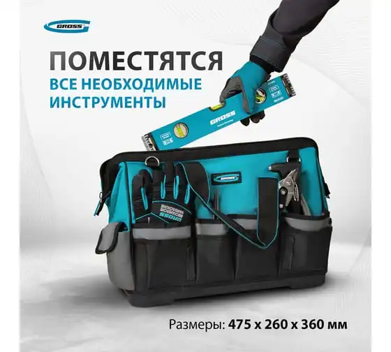 Переноска для инструмента GROSS 400x225x300 мм, пластиковое дно, наплечный ремень 90274