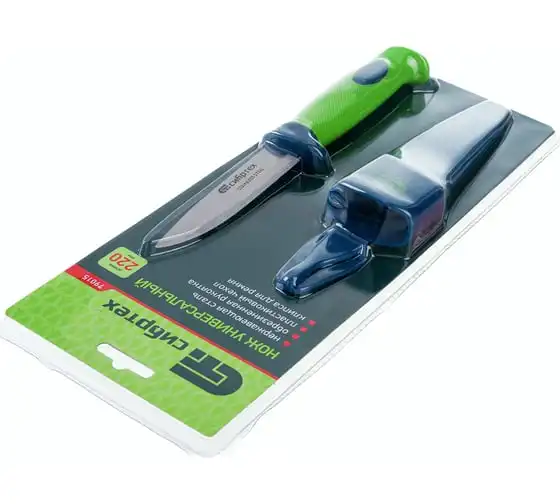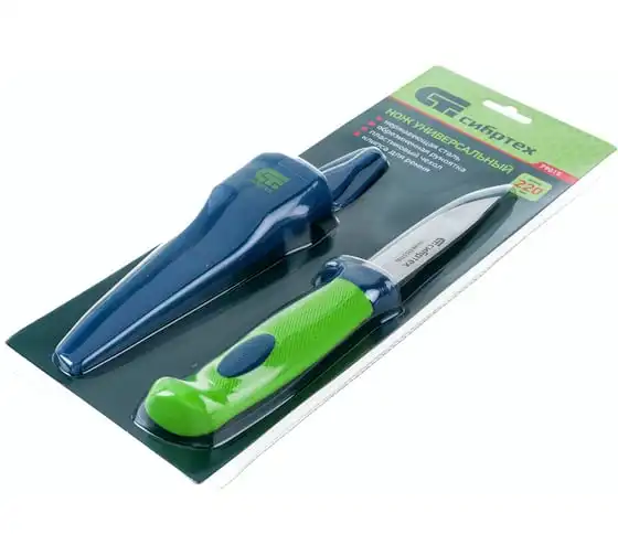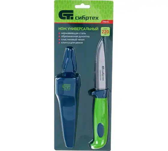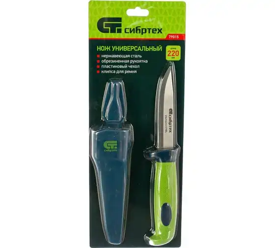 Универсальный нож с чехлом, обрезиненная рукоятка, 220 мм, лезвие - 100 мм СИБРТЕХ 79015
