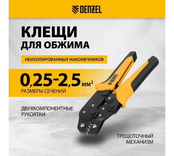 Клещи для обжима неизолированных наконечников НК и НВ, разъемов РП Denzel 0.25 - 2.5 кв. мм 17745