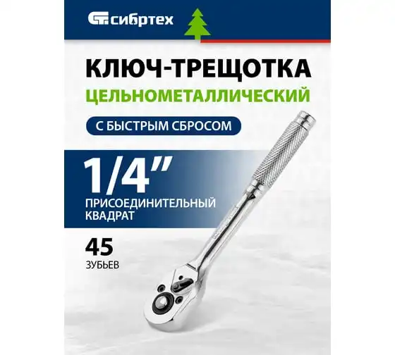 Ключ-трещотка СИБРТЕХ 1/4, 45 зубьев, цельнометаллический, с быстрым сбросом, CrV, хром 14014
