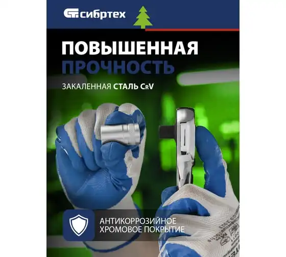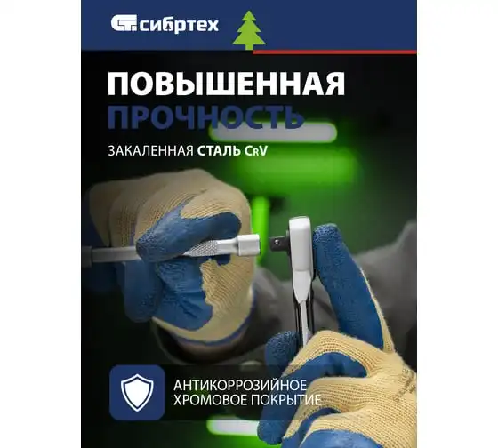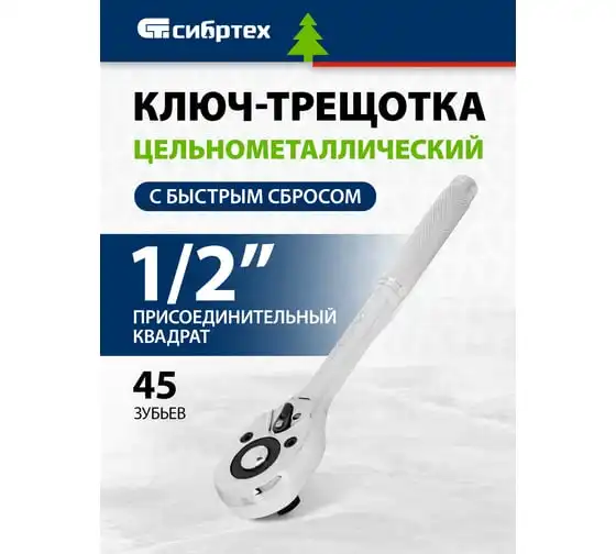 Ключ-трещотка СИБРТЕХ 1/2, 45 зубьев, цельнометаллический, с быстрым сбросом, CrV, хром 14019