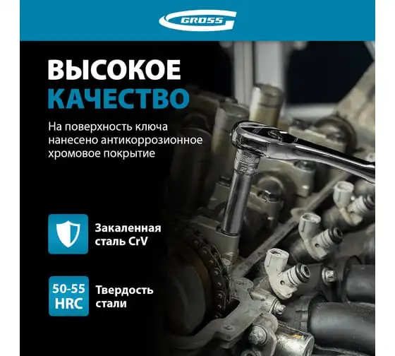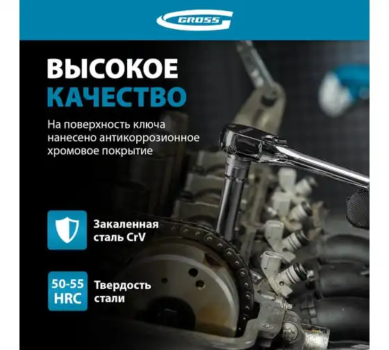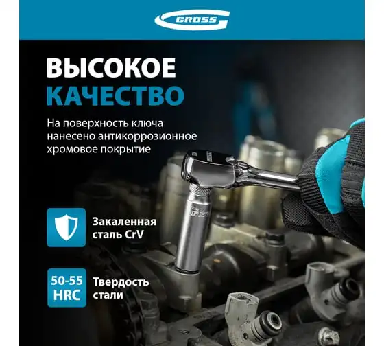 Ключ-трещотка GROSS 1/2", CrV, 90 зубьев, усиленный, хром 14055