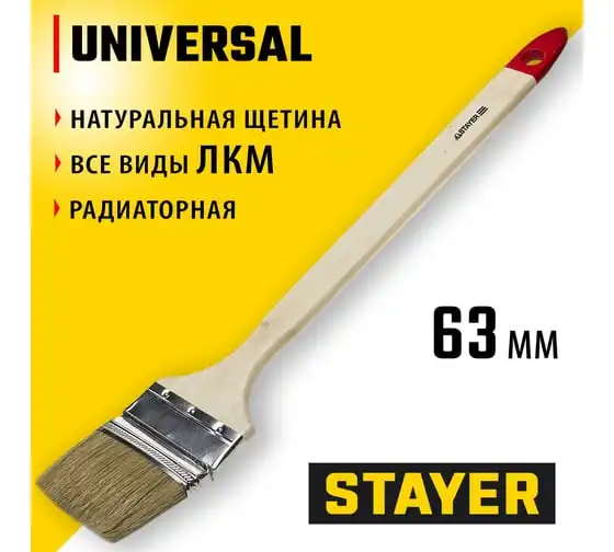 Радиаторная кисть STAYER UNIVERSAL светлая натуральная щетина, деревянная ручка, 63мм, 2.5" 0111-63