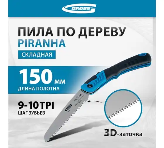 Пила по дереву GROSS PIRANHA складная, для кэмп.и сада, 150 мм, 9-10TPI, зуб 3D, подкал.зуб, 2-ком.рук. 23616