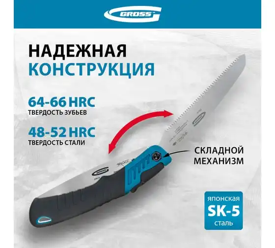 Пила по дереву GROSS PIRANHA складная, для кэмп.и сада,130 мм, 8-9 TPI, кал.зуб, 3D, обрезин.рук, кобура 23620