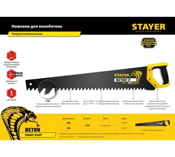Ножовка по пенобетону Stayer Beton Cut 500 мм, шаг 20 мм, 12 твердосплавных резцов 2-15096