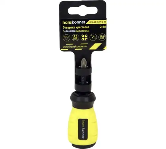 Крестовая отвертка Hanskonner 2x38 алмазный наконечник, твердость 59 HRC, S2, HK1040-16-PH2-38
