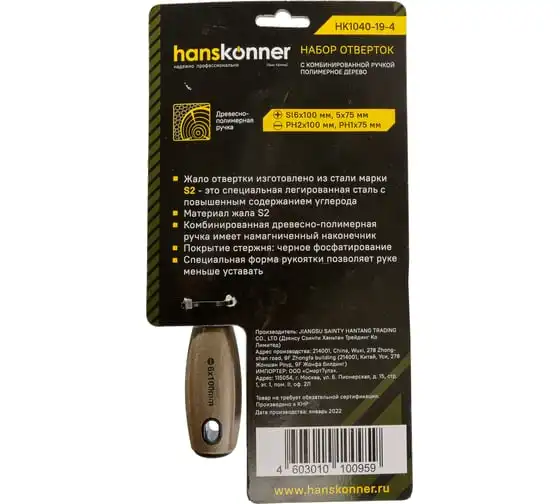 Крестовая отвертка Hanskonner 2x100 алмазный наконечник, твердость 59 HRC, S2 HK1040-16-PH2-100