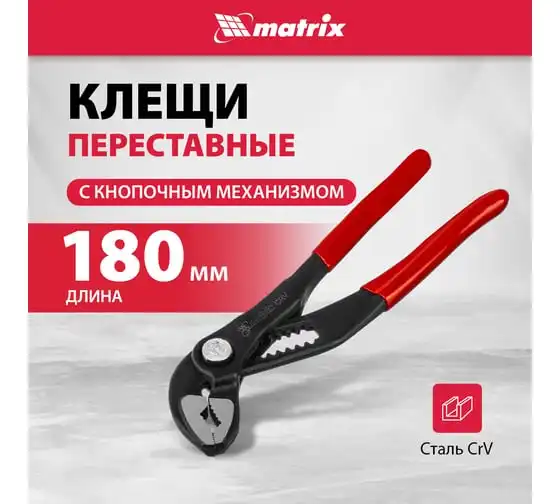 Переставные клещи MATRIX 180 мм, кнопочный механизм, хром-ванадий, обливные рукоятки 17925