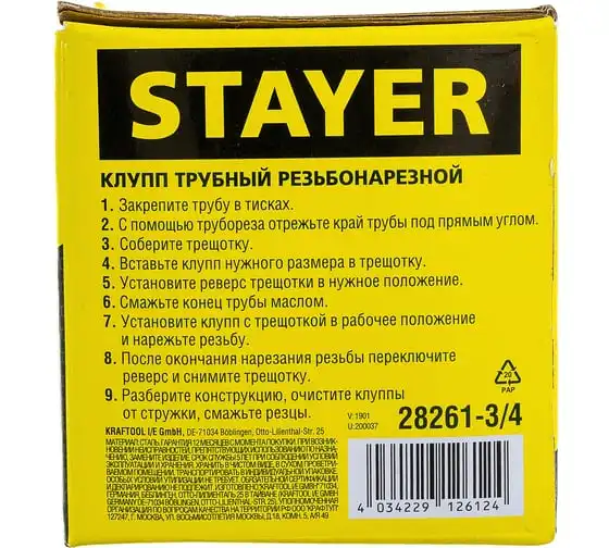 Трубный резьбонарезной клупп STAYER 3/4" 28261-3/4
