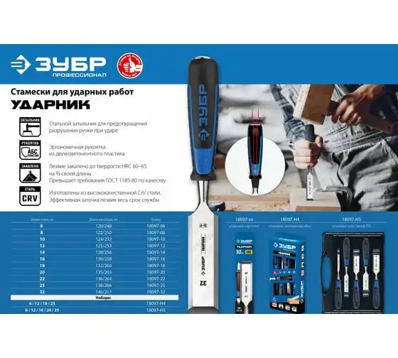 Набор стамесок-долот ЗУБР Ударник 4 шт 18097-H4