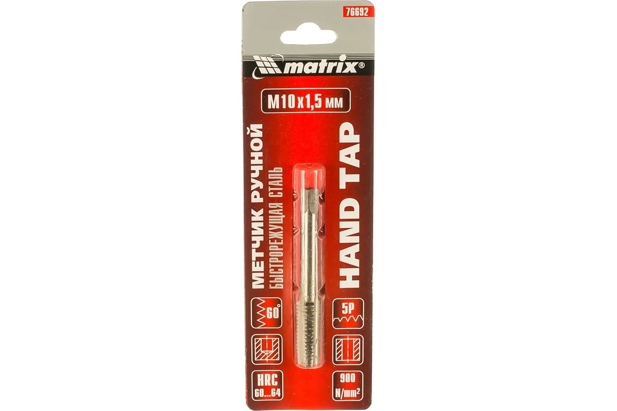 Ручной метчик Matrix 76692 — резьбонарезной инструмент, который используется для создания резьбы диаметром М10 и шагом 1,5 мм. Оптимален для работы с деталями из твердой стали прочностью до 900 Н/мм2. Нарезает резьбу за один проход. Метчик устанавливается на метчикодержатель с патроном под хвостовик 5,4 мм. Будет полезен в слесарной мастерской, а также дома или в гараже.