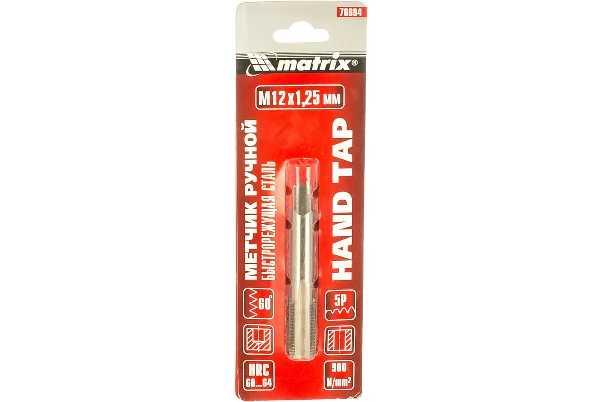 Ручной метчик М12 х 1,25 мм MATRIX 76694 используется для нарезания резьбы в отверстиях. Сделан из быстрорежущей стали Р6М5, поэтому отличается твердостью 60.64 HRC и может работать в условиях высоких нагрузок. Также данный метчик обладает стабильностью свойств.