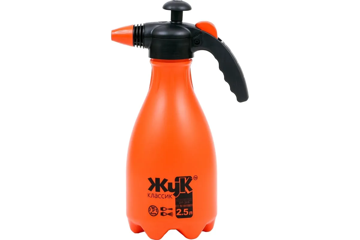 Ручной опрыскиватель Жук Классик 2.5 л 4607156362417 используется для ухода за горшечными, домашними растениями, рассадой. При помощи опрыскивателя осуществляется бережное орошение, внесение жидких удобрений, подкормки. Посредством поворота форсунки можно регулировать тип струи - от направленной до мелкодисперсного распыления. На основании бутыли предусмотрен поддон - для лучшей устойчивости. Емкость выполнена из качественного пластика.