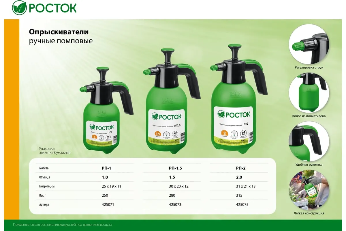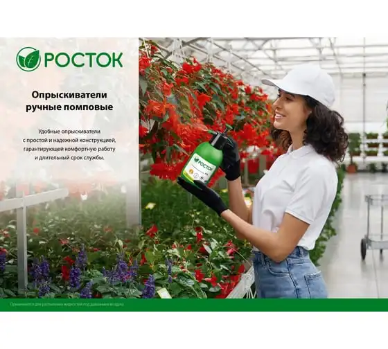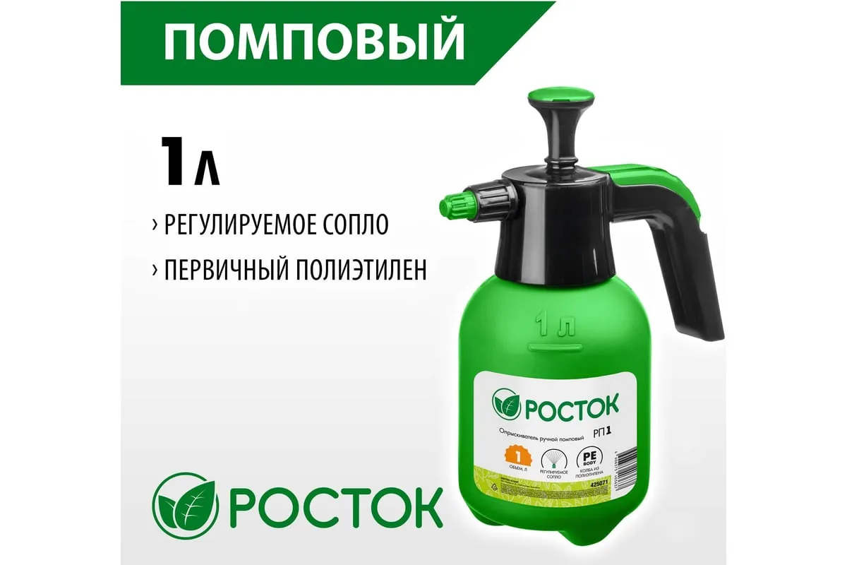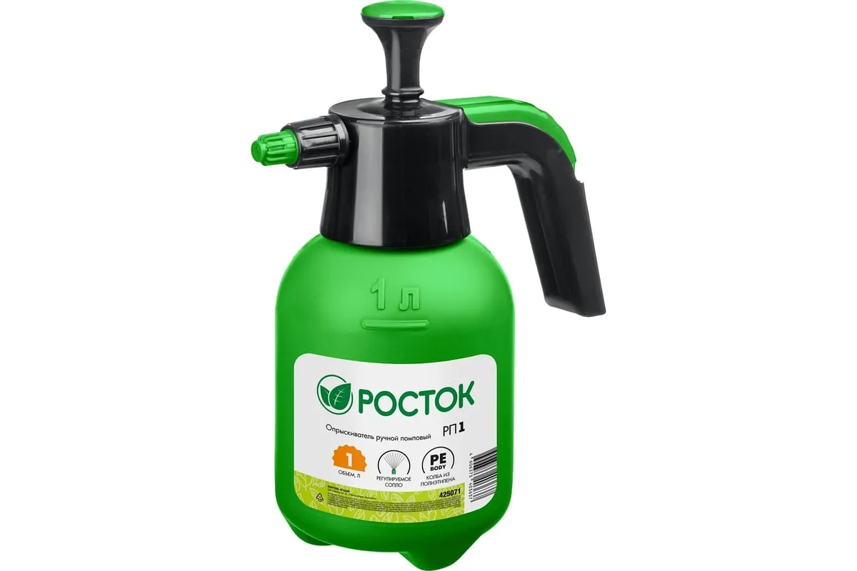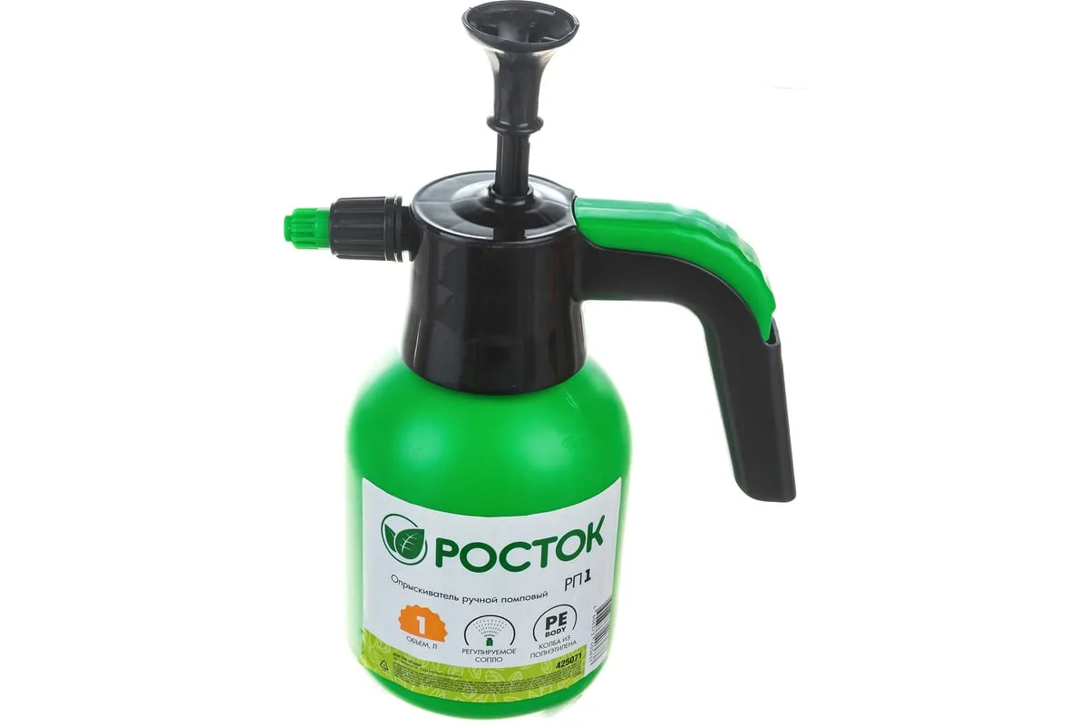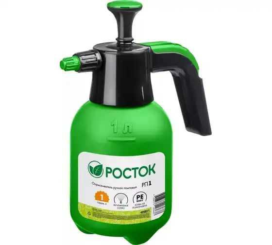 Ручной помповый опрыскиватель РОСТОК РП-1 1 л 425071 предназначен для дезинфекционных работ и ухода за растениями в овощеводстве, садоводстве, цветоводстве. Удобство использования. Форма рукояти позволяет комфортно держать распылитель. Колба изготовлена из полиэтилена, благодаря чему отличается небольшим весом и устойчивостью к ударам.