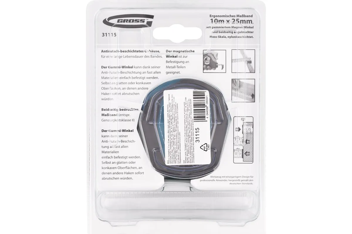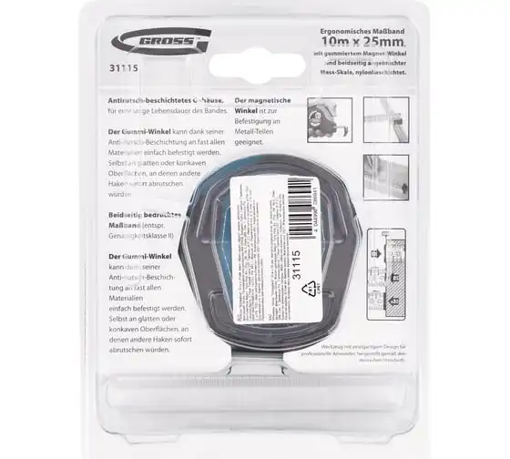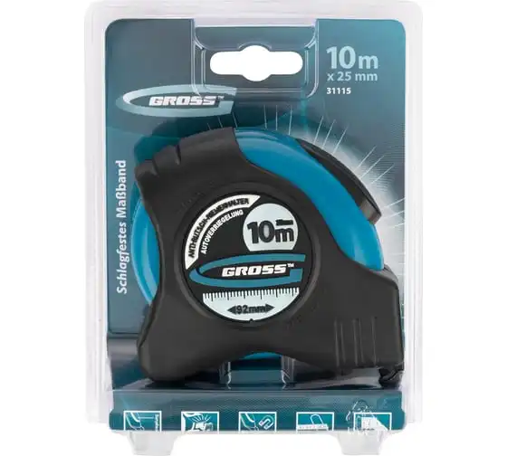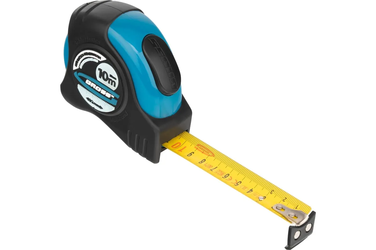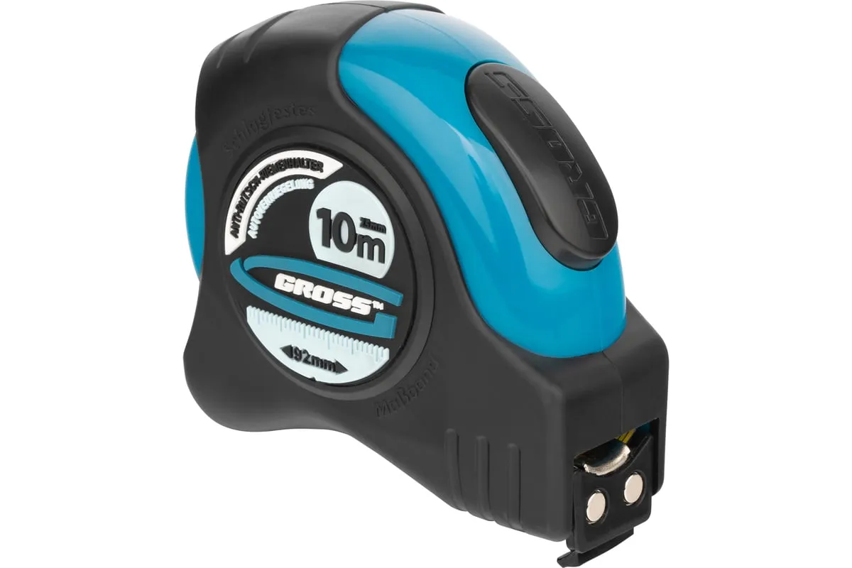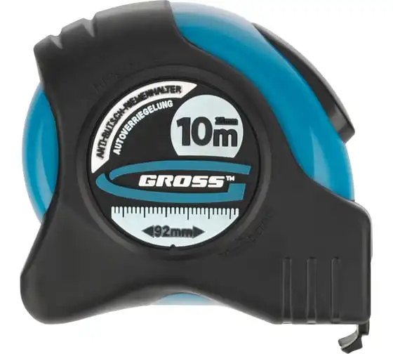 Рулетка Gross «Schlagfest» 31115 с магнитным обрезиненным зацепом, двухсторонней шкалой и функцией автоматической фиксации полотна, 10 м х 25 мм, позволяет определять размеры материалов, вычислять площадь помещения и проводить другие измерительные работы Карманная рулетка — незаменимый инструмент в хозяйстве и на строительной площадке. Магнитный обрезиненный зацеп обеспечивает возможность захвата скользких и металлических поверхностей со сложной формой.